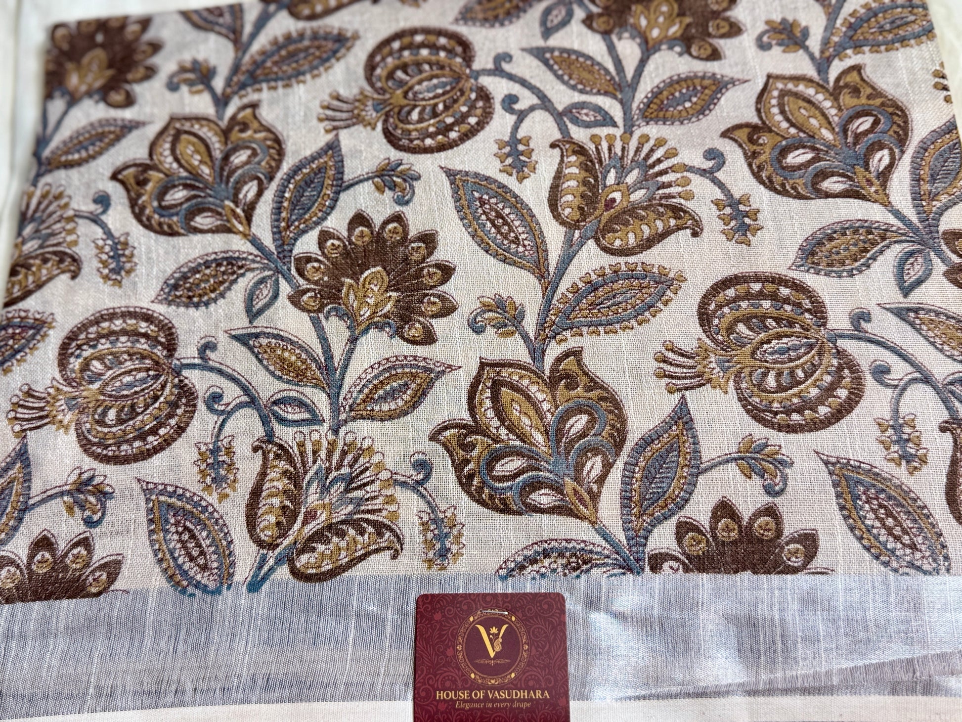 Design: All-over floral jaal (creeper-style) print featuring stylized lotuses, paisley buds, and blooming vines.The print carries a Kalamkari-meets-Mughal influence — where artistic florals flow organically, forming a graceful rhythm.