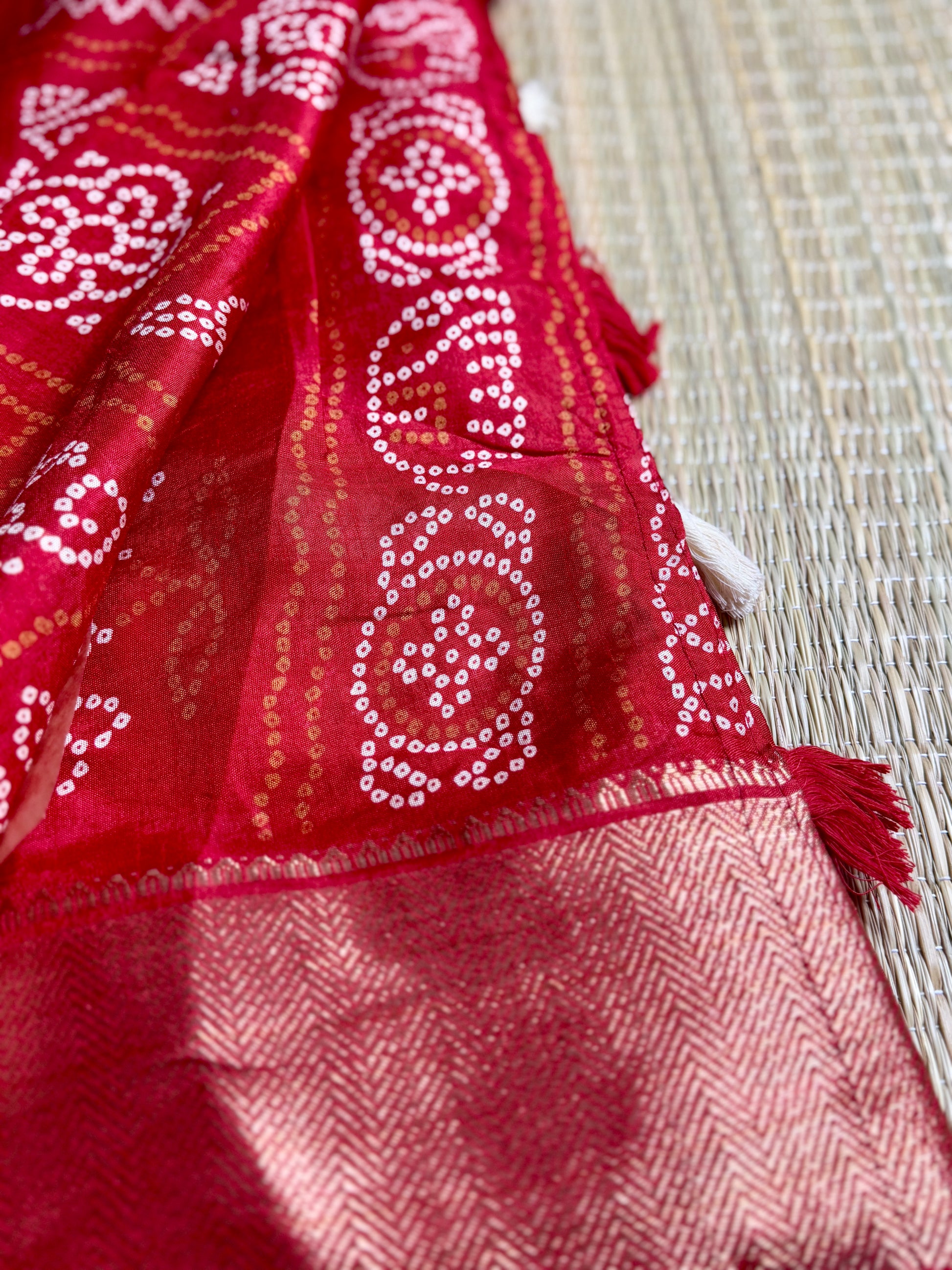 Design : Immerse yourself in timeless elegance with this exquisite Dola silk Bandhani saree, a perfect blend of tradition and sophistication. Handcrafted with precision, the saree features intricate Bandhani tie-dye patterns forming geometric and floral motifs.The lustrous Dola silk fabric drapes gracefully, offering a luxurious sheen and a soft, comfortable feel.The saree is beautifully complemented with a shimmering zari border in a herringbone weave, adding a regal charm to your festive or wedding look