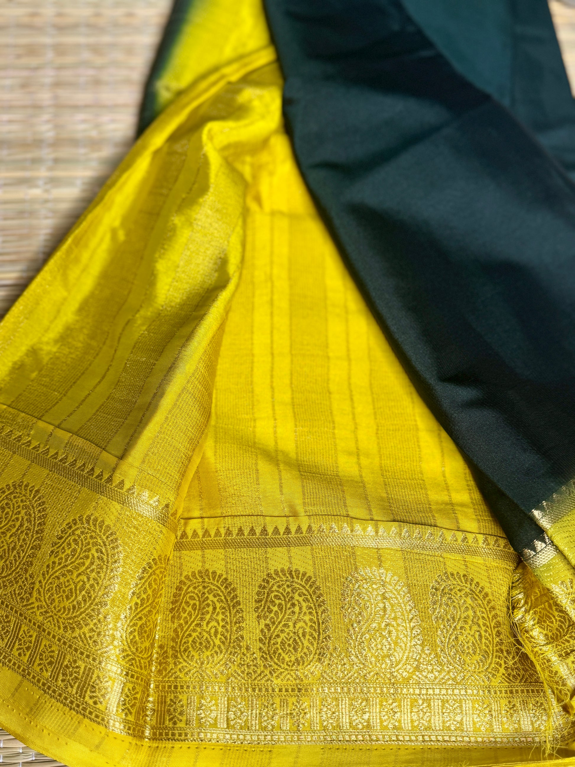 Bottle Green & Mustard yellow contrast Semi Mysore silk crepe
