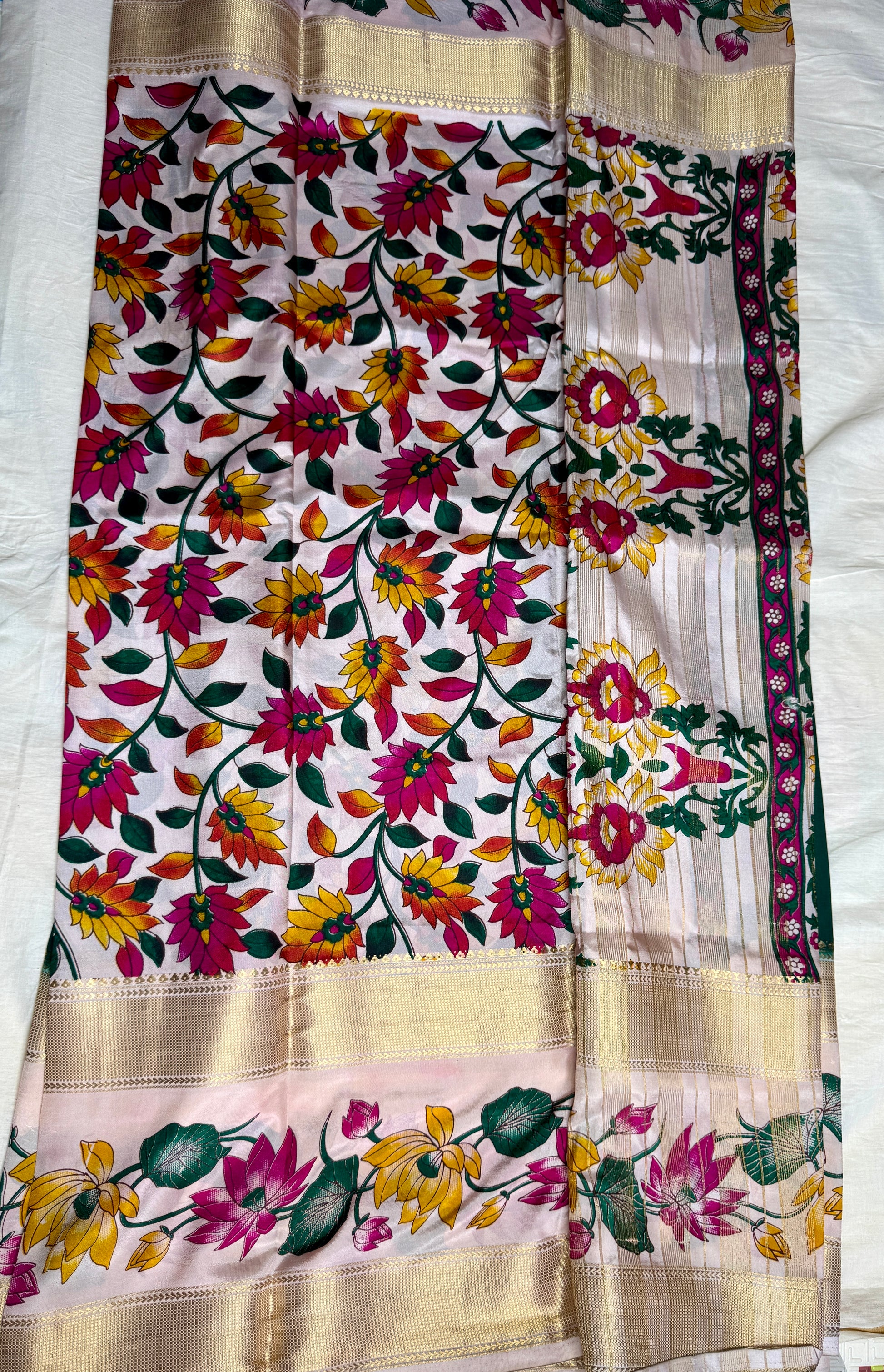 The saree features a smooth, lustrous body paired with a gracefully printed bold floral artistry in Bentex border. The exquisite floral design lends a refreshing aesthetic that strikes a balance between traditional charm and modern vibrancy.