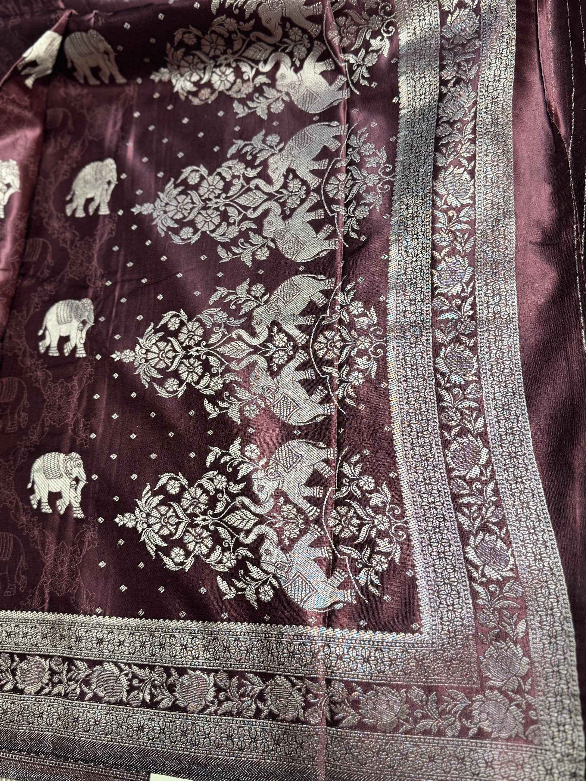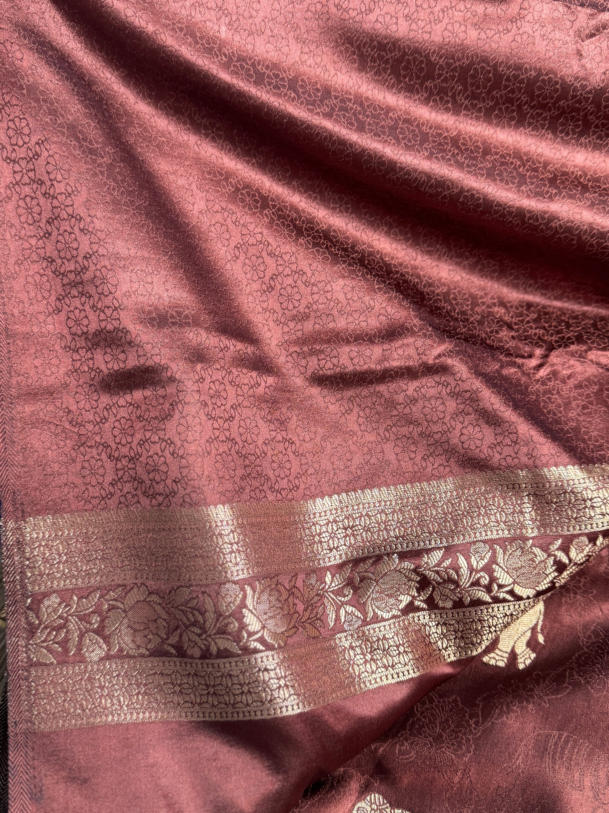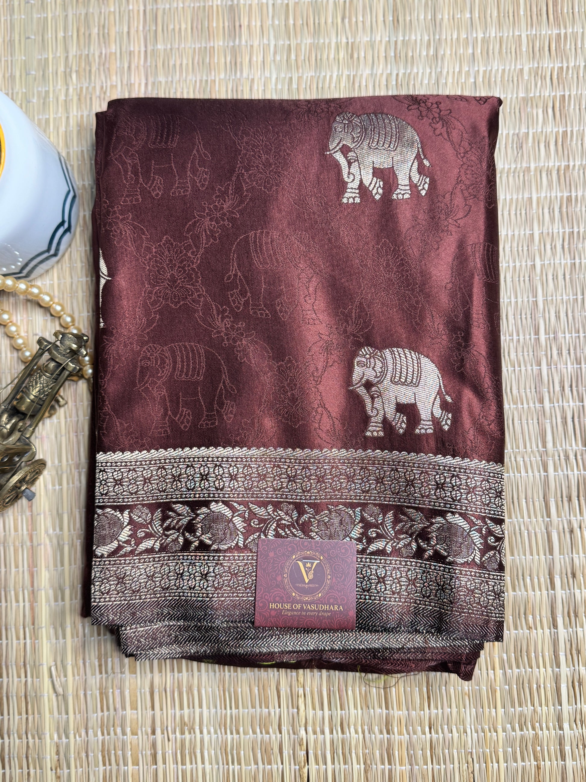 The saree features a smooth satin silk body with an elegant woven texture, enhanced by intricate elephant zari motifs inspired by traditional artistry. The body is adorned with finely detailed woven patterns that add depth and subtle richness. It is complemented by a beautifully crafted contrast border woven with ornate zari floral and decorative motifs. The pallu is richly detailed with elaborate zari work, lending the saree a luxurious finish and graceful drape.