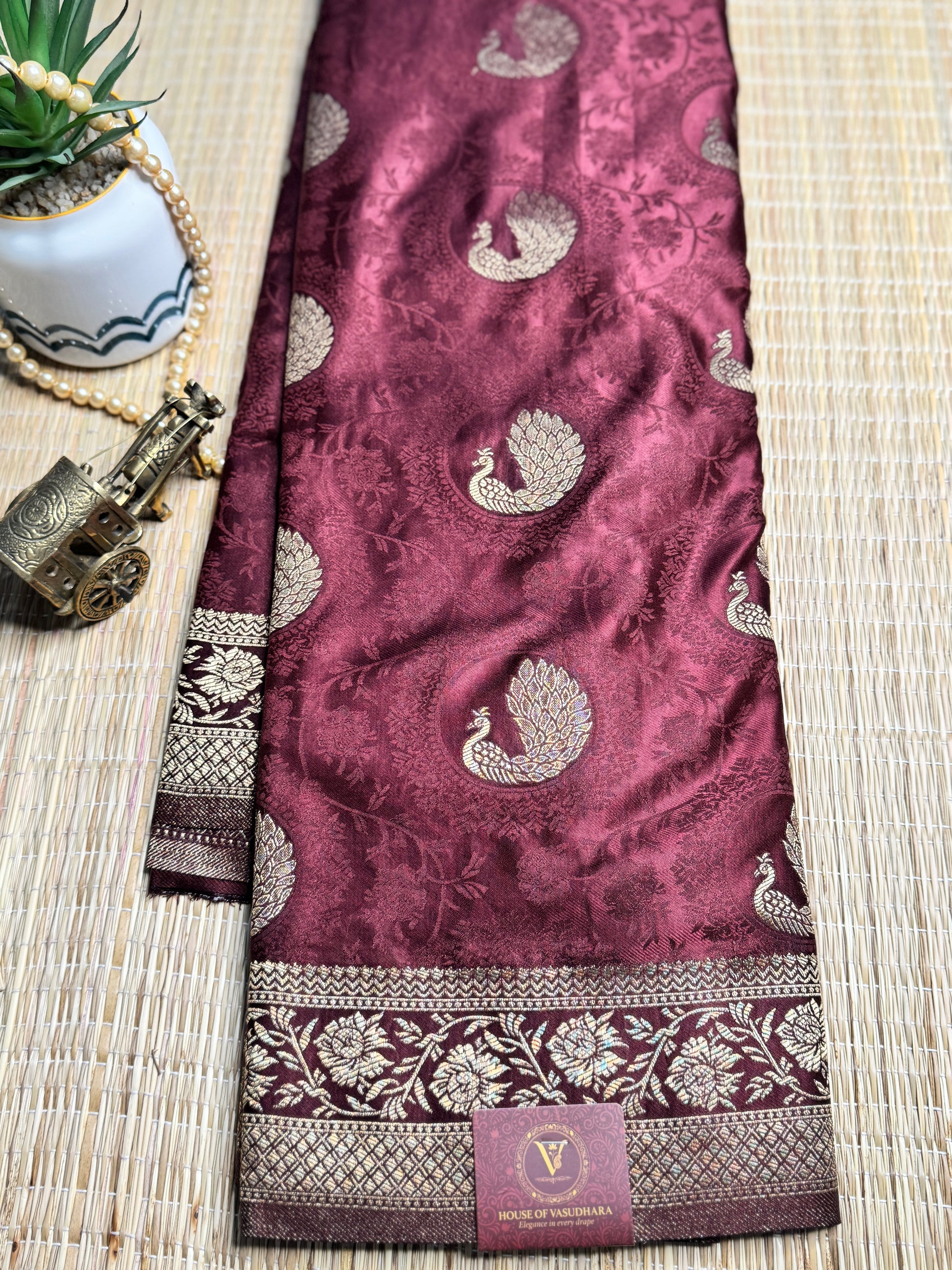 The saree features a smooth satin silk body with an elegant woven texture, enhanced by intricate peacock zari motifs inspired by traditional artistry. The body is adorned with finely detailed woven patterns that add depth and subtle richness. It is complemented by a beautifully crafted contrast border woven with ornate zari floral and decorative motifs. The pallu is richly detailed with elaborate zari work, lending the saree a luxurious finish and graceful drape.