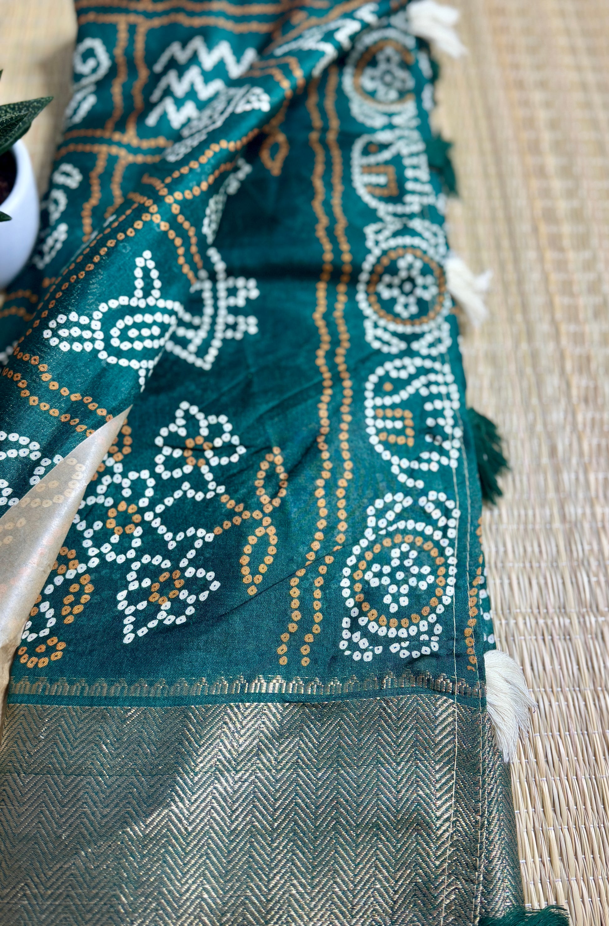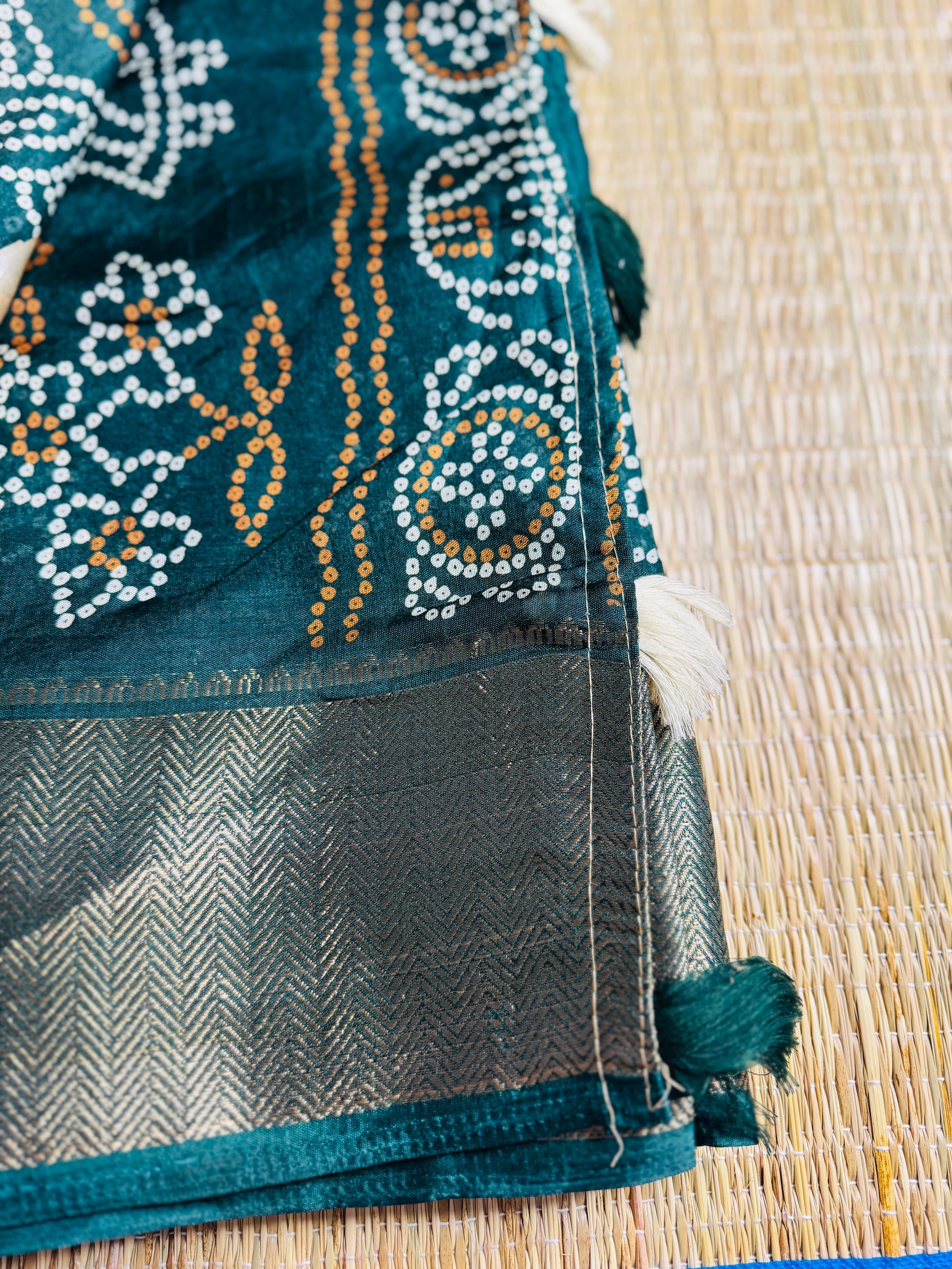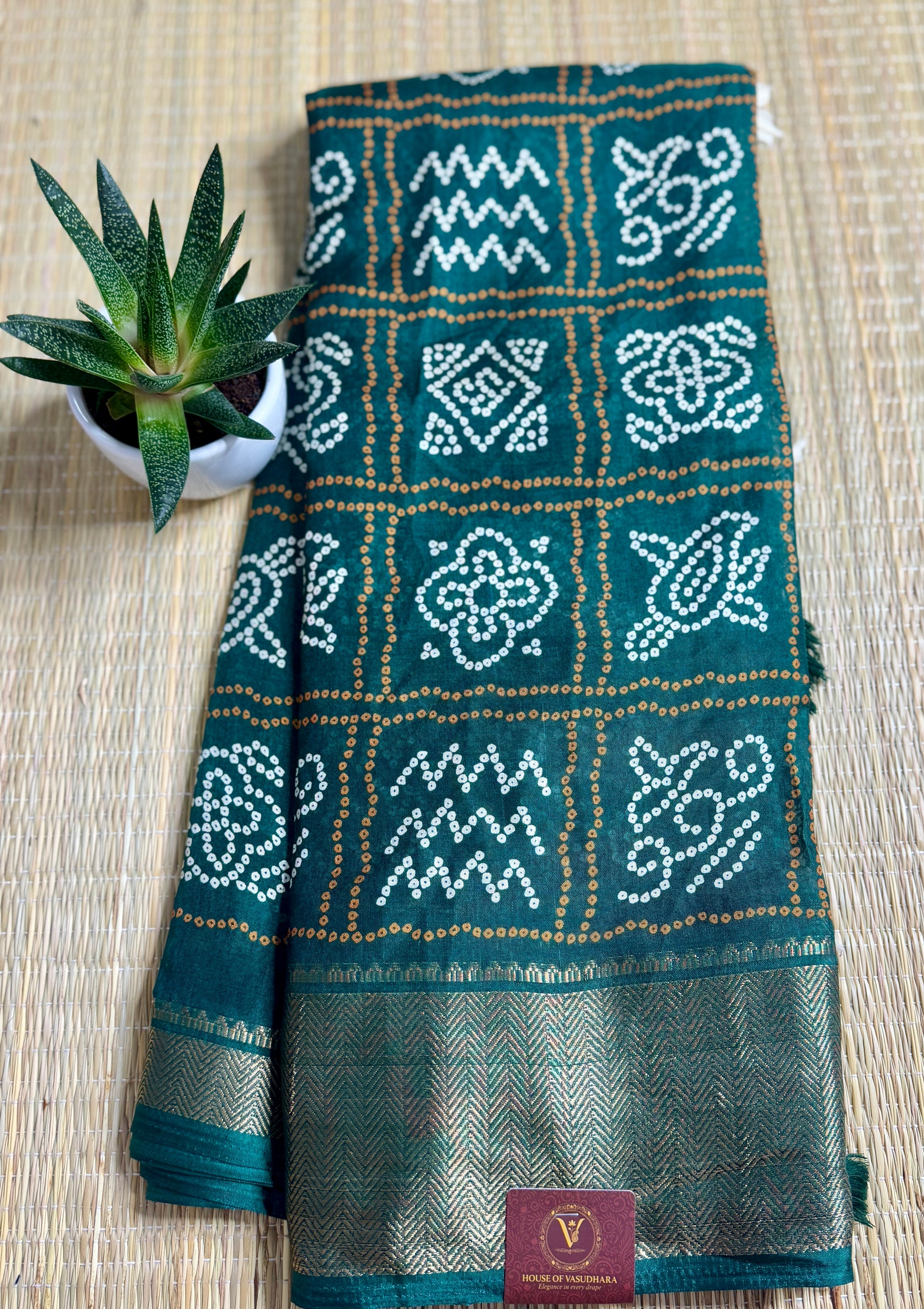 Bottle Green Dola Bandhani Silk Saree with Zari Border
