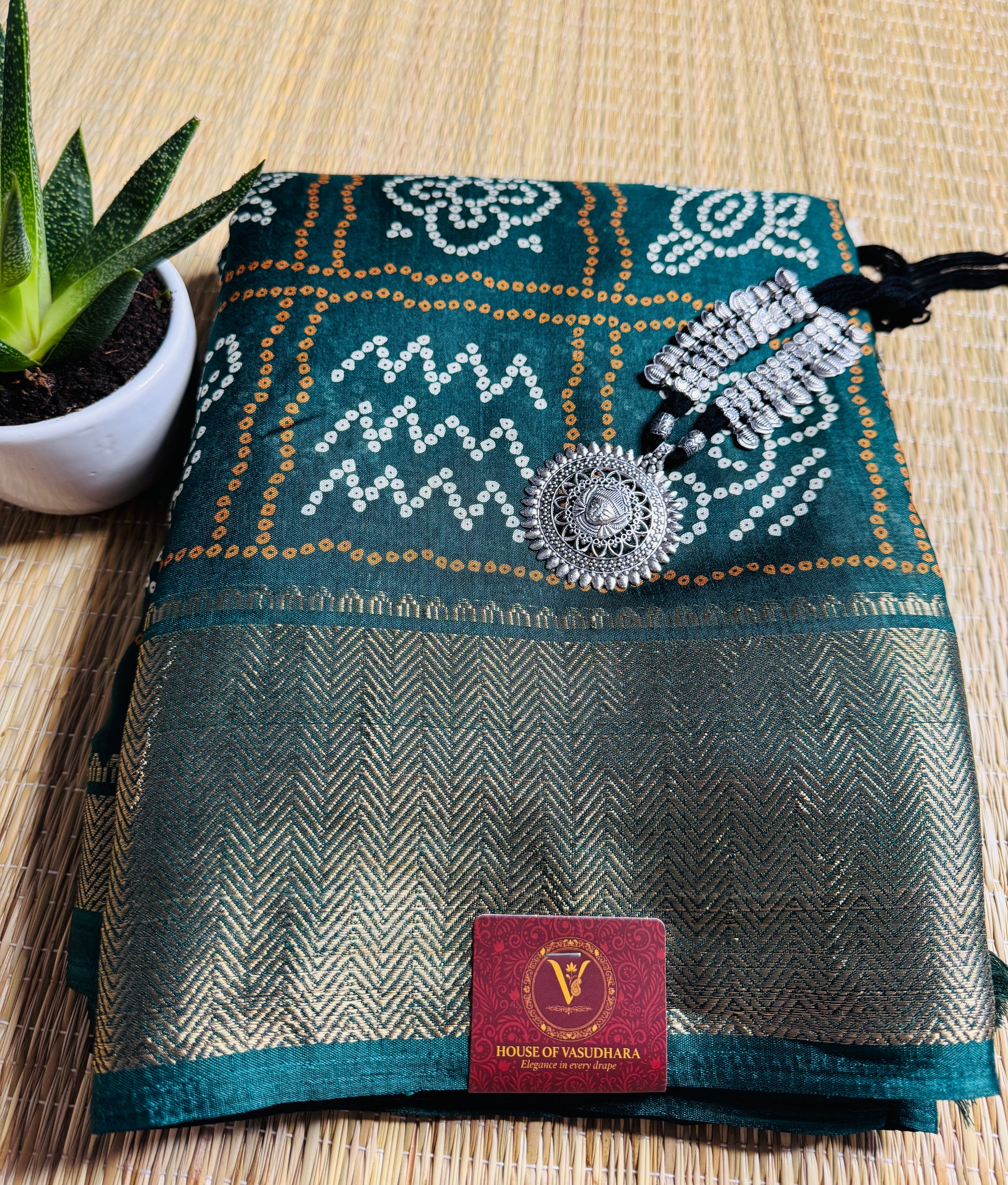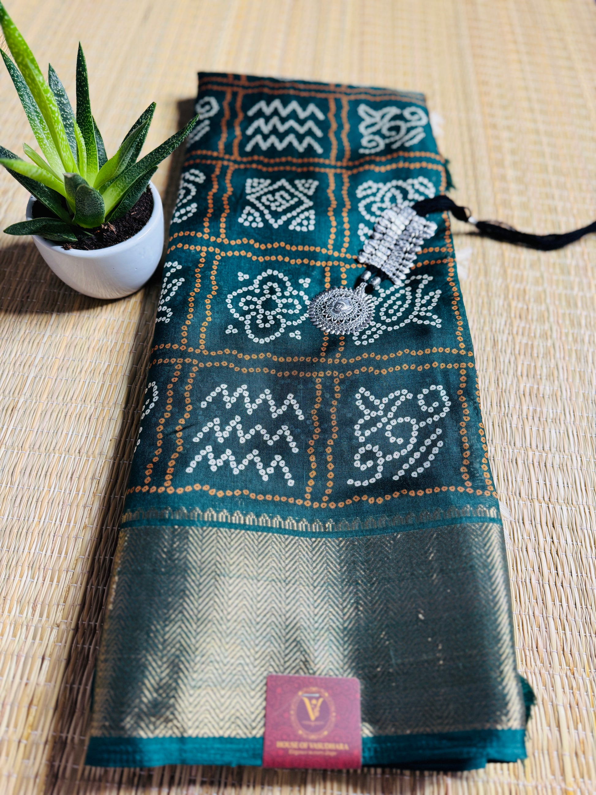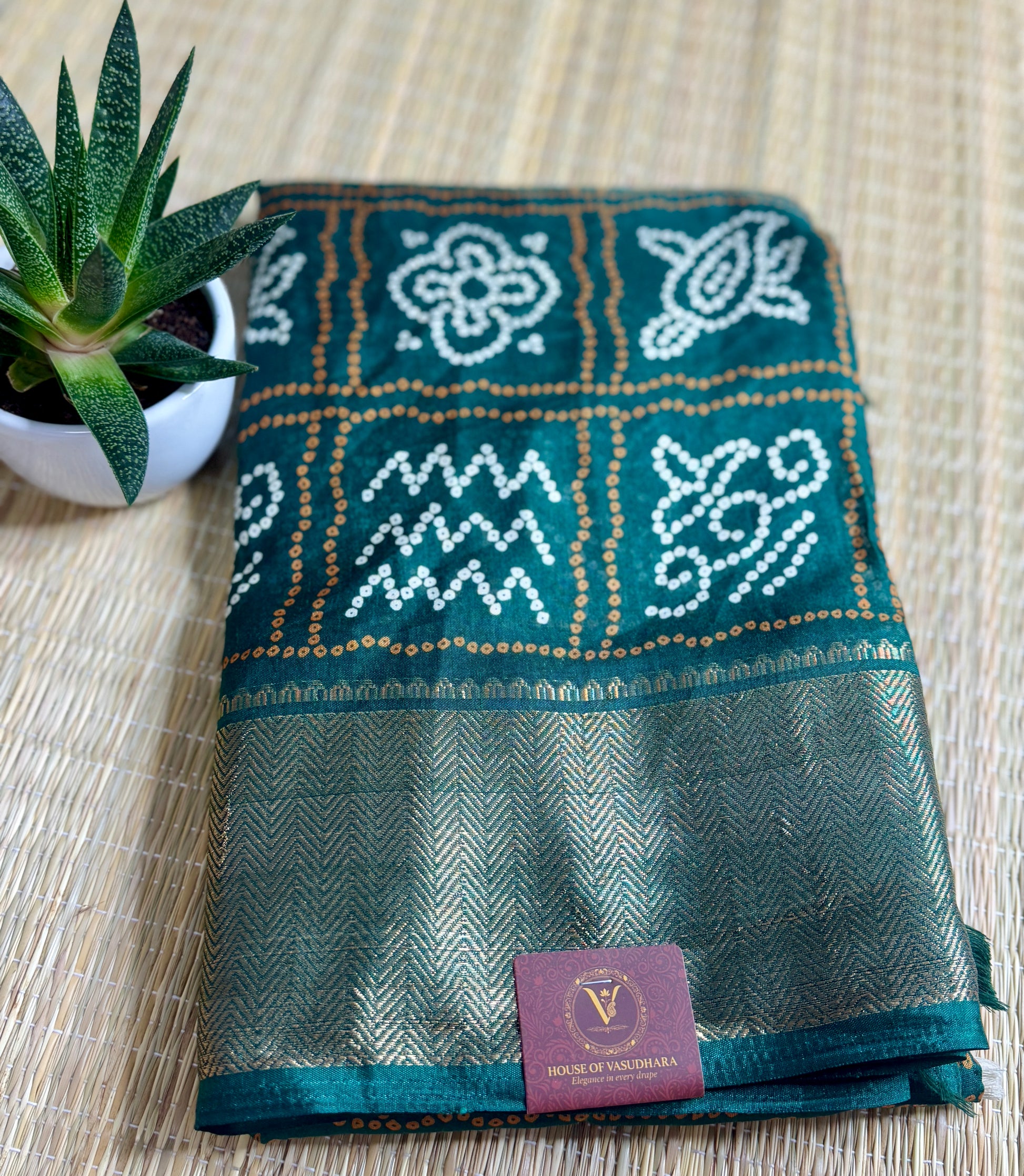 Bottle Green Dola Bandhani Silk Saree with Zari Border