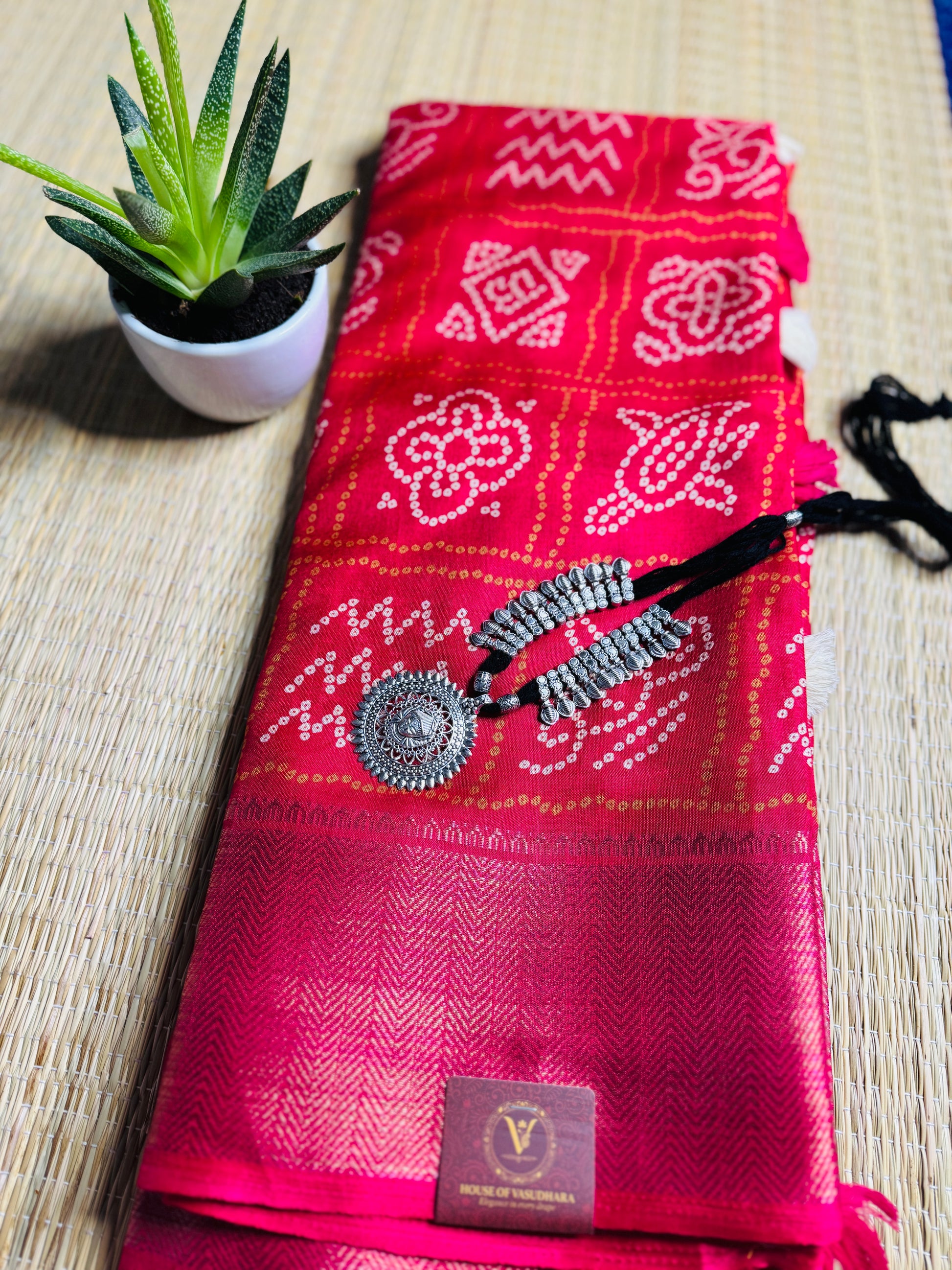 Design : Immerse yourself in timeless elegance with this exquisite Dola silk Bandhani saree, a perfect blend of tradition and sophistication. Handcrafted with precision, the saree features intricate Bandhani tie-dye patterns forming geometric and floral motifs.The lustrous Dola silk fabric drapes gracefully, offering a luxurious sheen and a soft, comfortable feel.The saree is beautifully complemented with a shimmering zari border in a herringbone weave, adding a regal charm to your festive or wedding look