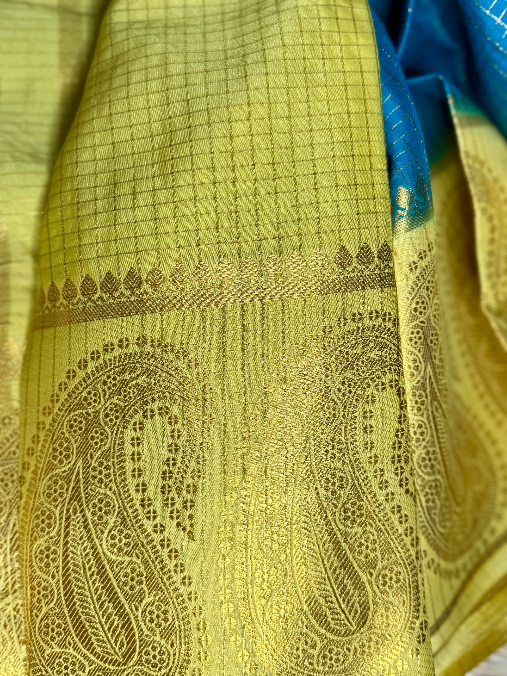 This Saree has a Radiating traditional charm with a touch of modern finesse.The Body has subtle golden thread check patterns woven throughout, offering a graceful shimmer and understated texture that elevates the saree’s elegance. Border has contrasting border adorned with large paisley Mango motifs in gold zari, edged with a delicate temple design. The grandeur of the border is both bold and intricate, giving a rich finish to the overall drape.