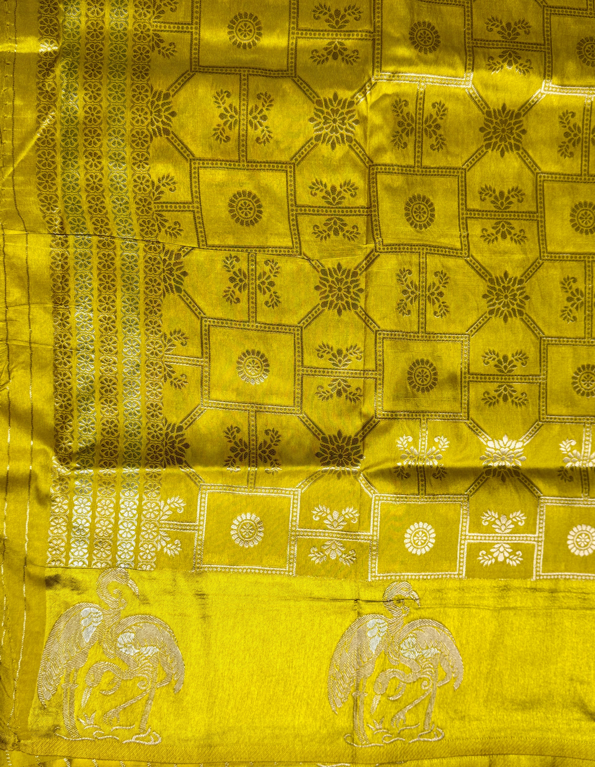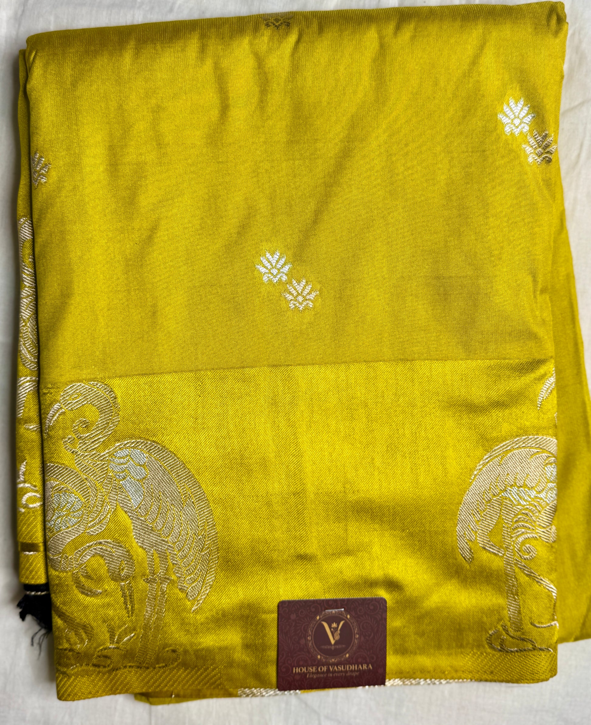 Design :Subtle all-over motifs in zari thread work. Prominent woven flamingo in Border done in shimmering silver zari — adds uniqueness and sophistication.The flamingo motif is a unique twist. Pallu is heavily adorned with intricate silver zari work. It has Geometric floral and temple motifs in a richly woven pattern.