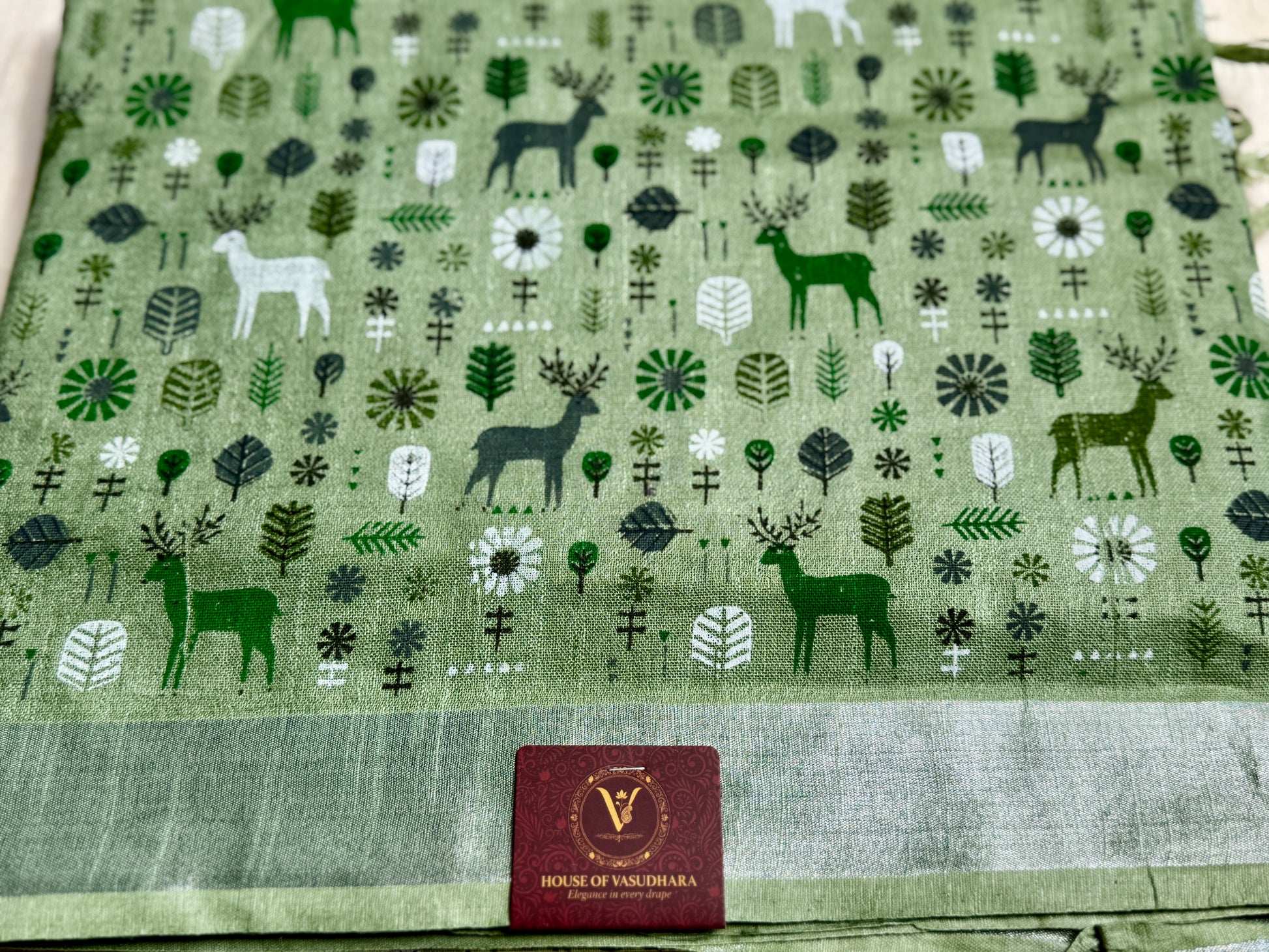 Design: This traditional hand block print saree features an enchanting digital print adorned with delicate deer, floral, and leaf motifs , beautifully spread across the body for a whimsical woodland look.