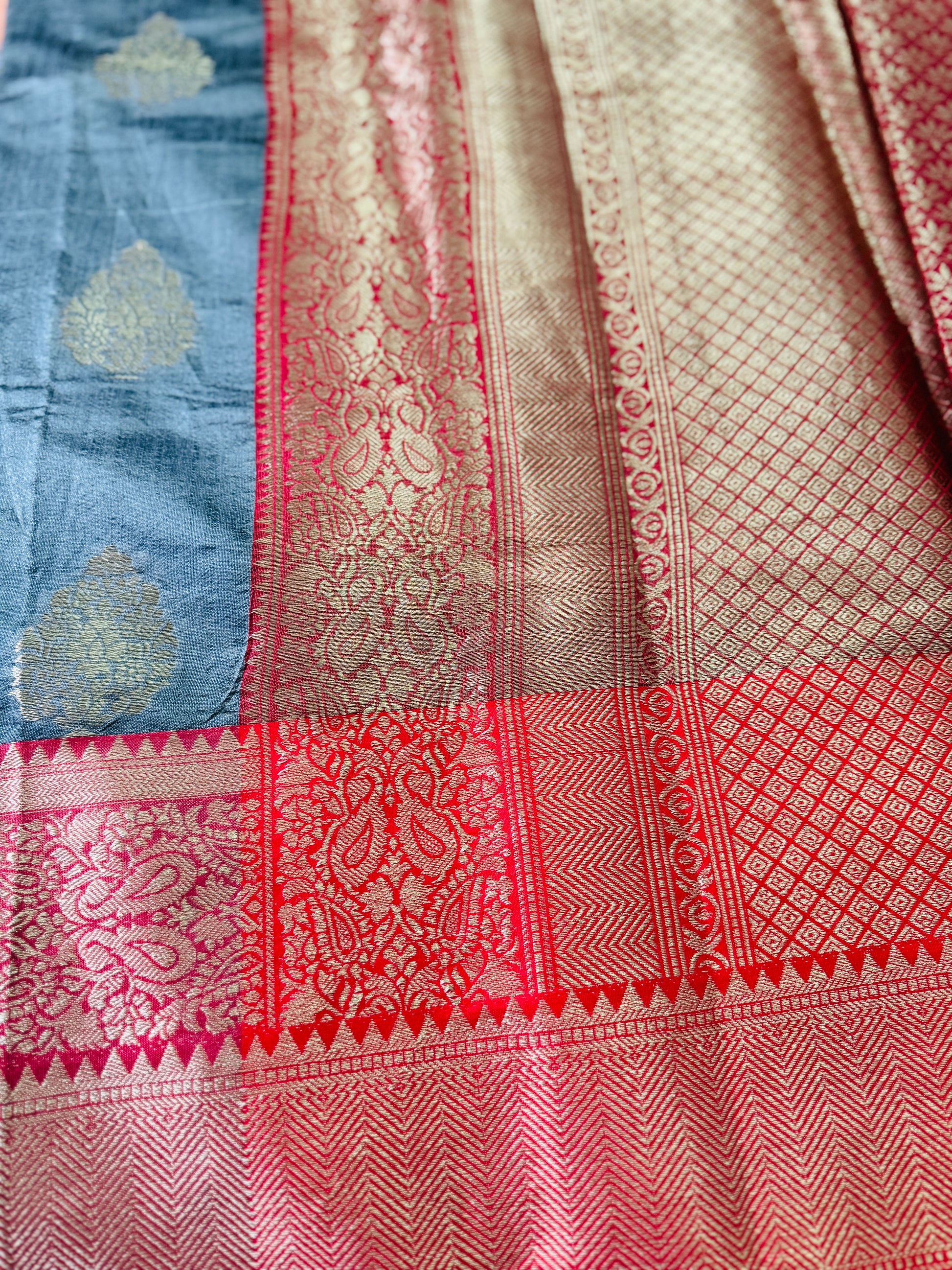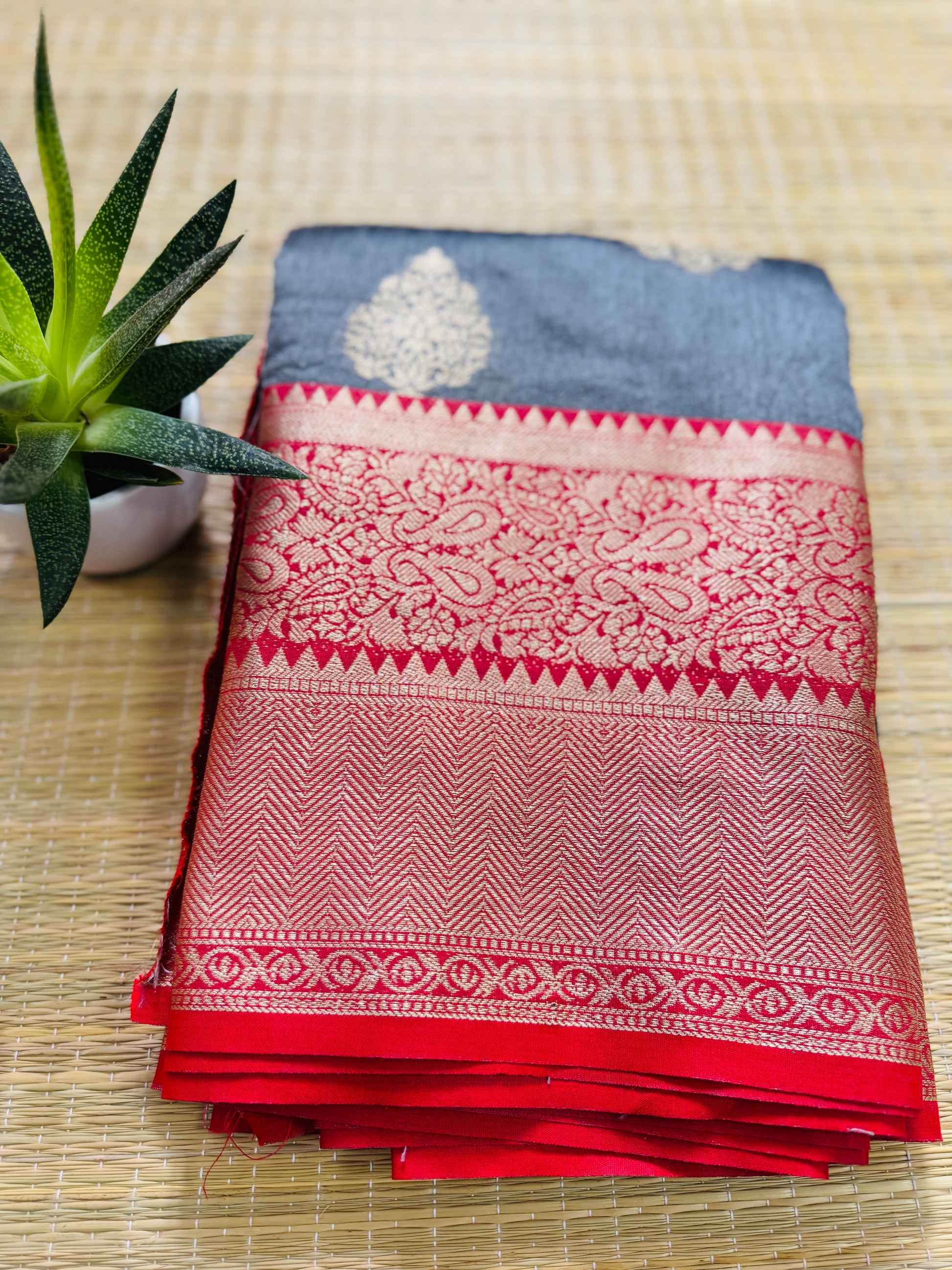Design : Grey with Red Contrast Border. The body features a sophisticated grey base adorned with gold zari buttas in traditional floral motifs, adding a touch of understated elegance.A striking red contrast border, intricately woven with rich zari work in floral and paisley patterns, enhances the saree’s regal charm.The pallu is a masterpiece in itself – adorned with opulent zari weaving in geometric, floral, and paisley designs, making it a true statement of Banarasi craftsmanship.