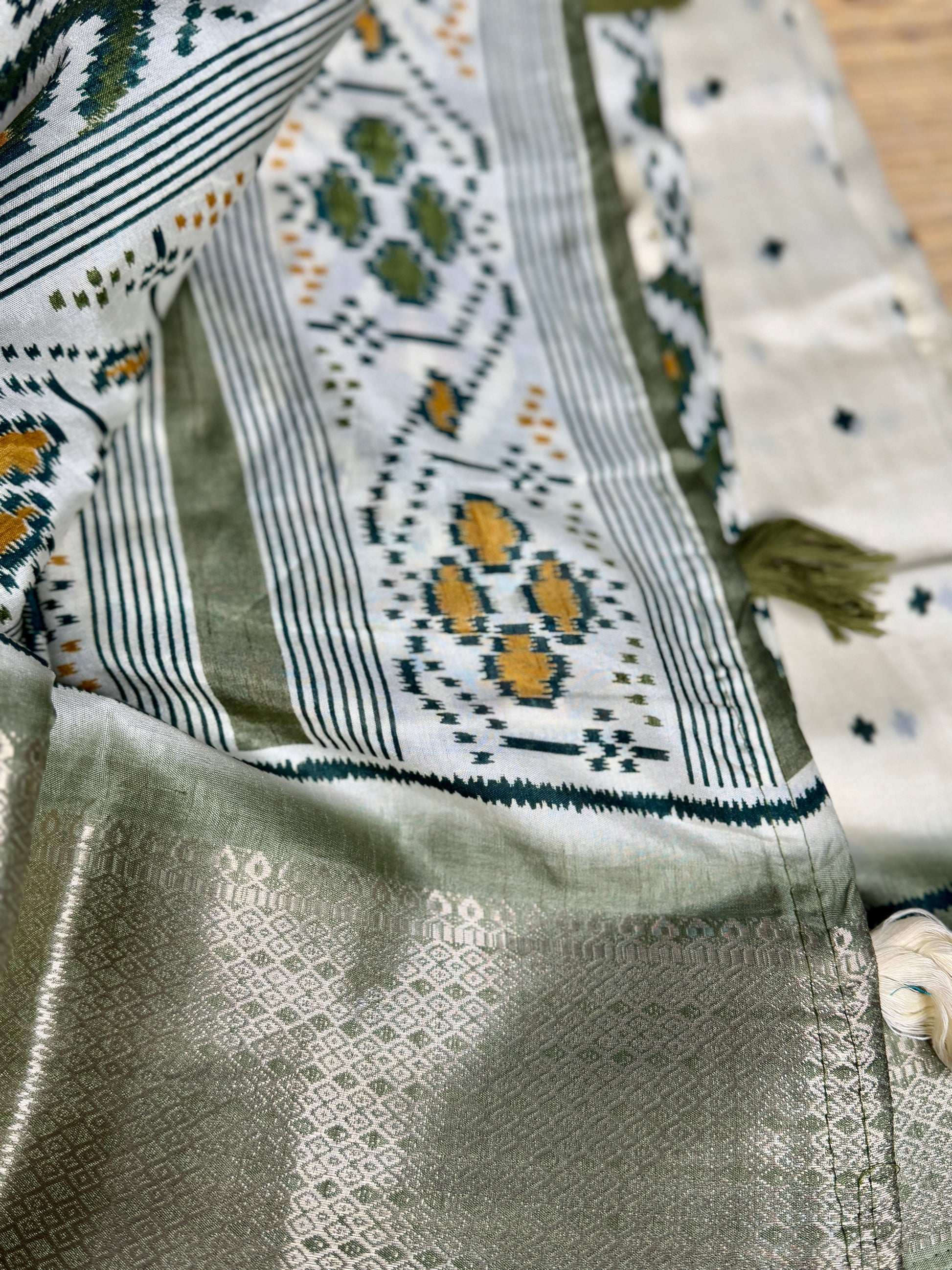 Woven in a soothing ivory base, it features intricate Ikat-inspired geometric motifs in rich magenta, earthy brown, and verdant green. The design transitions beautifully from delicate scattered patterns on the upper half to a bold diamond lattice towards the pallu, adding depth and character to the drape.
