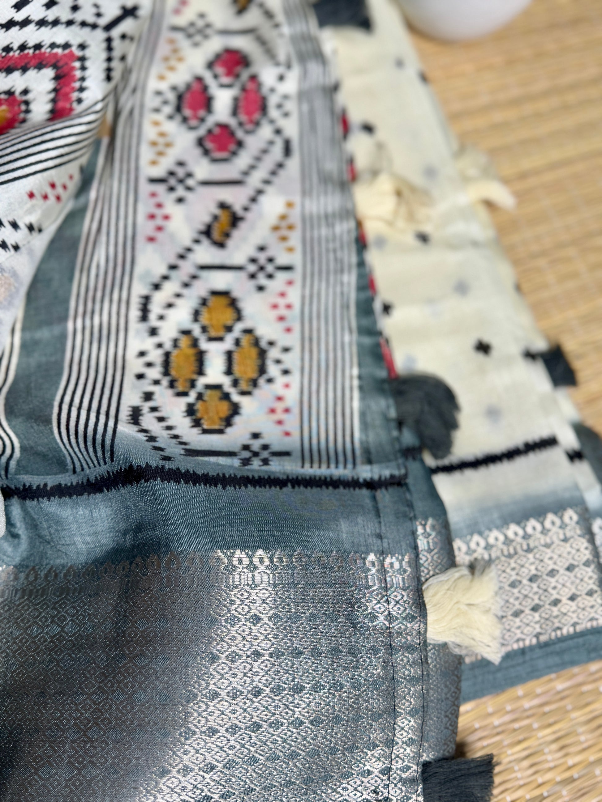 Woven in a soothing ivory base, it features intricate Ikat-inspired geometric motifs in rich magenta, earthy brown, and verdant green. The design transitions beautifully from delicate scattered patterns on the upper half to a bold diamond lattice towards the pallu, adding depth and character to the drape.