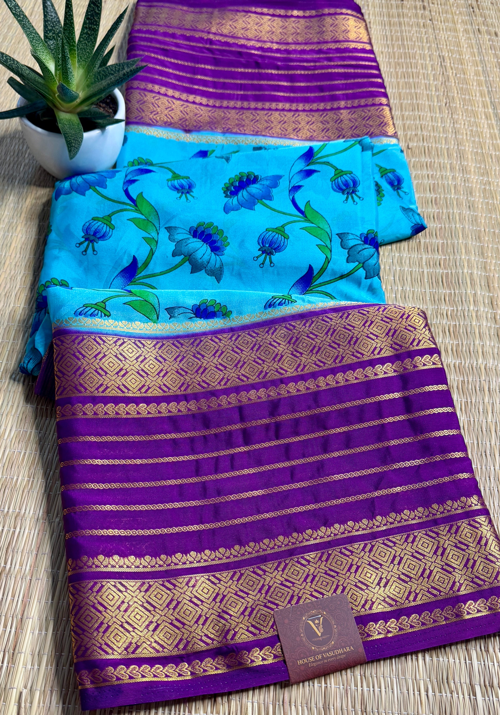 Blue Mysore silk Crepe Saree in Meenakari work with Bentex Border