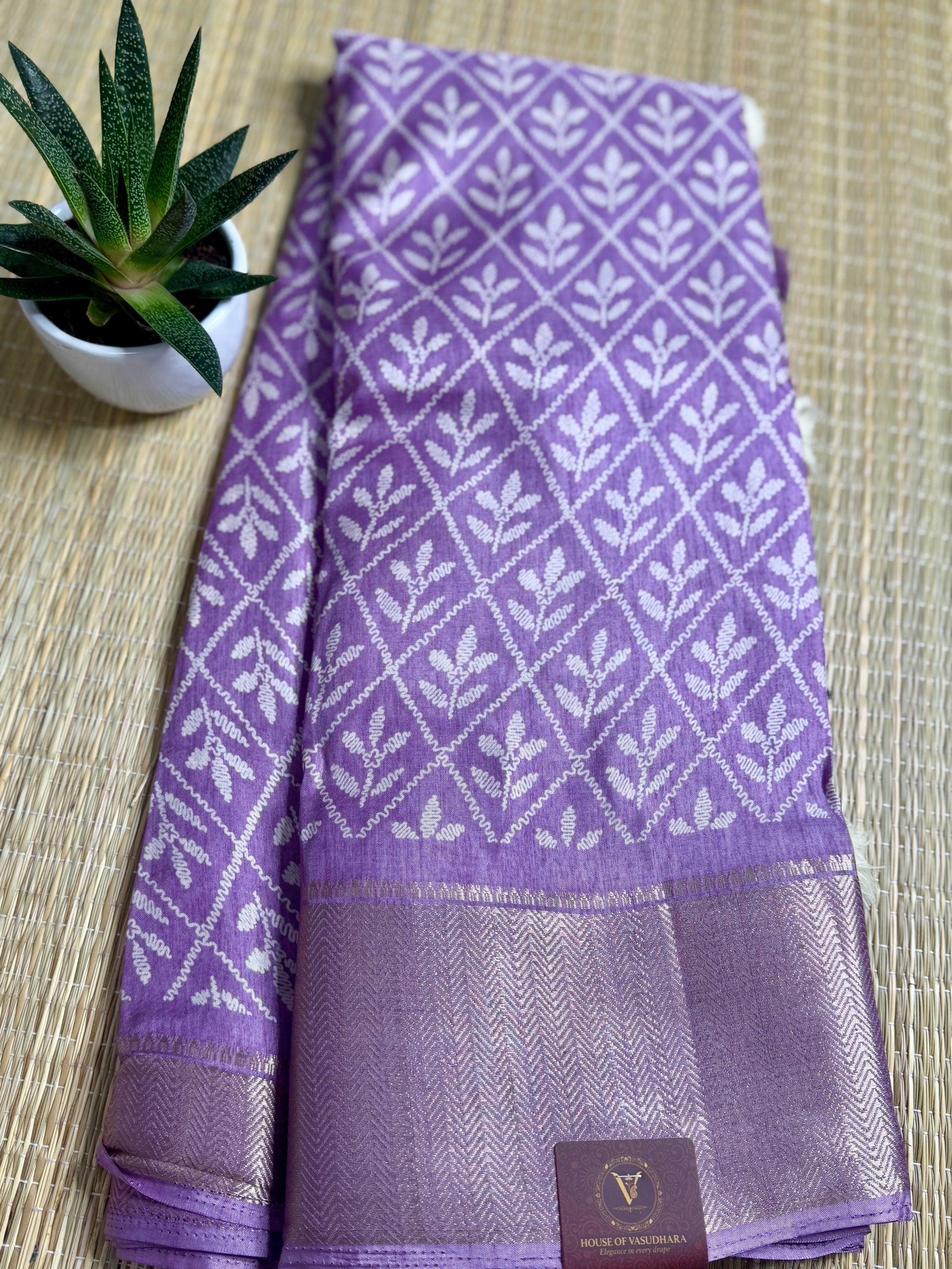 Design : This exquisite dola silk saree features intricate white Leafy vine print, blending traditional charm with refined elegance. The body is adorned with alternating paisley and leafy vine motifs.The soft sheen of dola silk enhances its graceful drape, making it perfect for festive and special occasions.