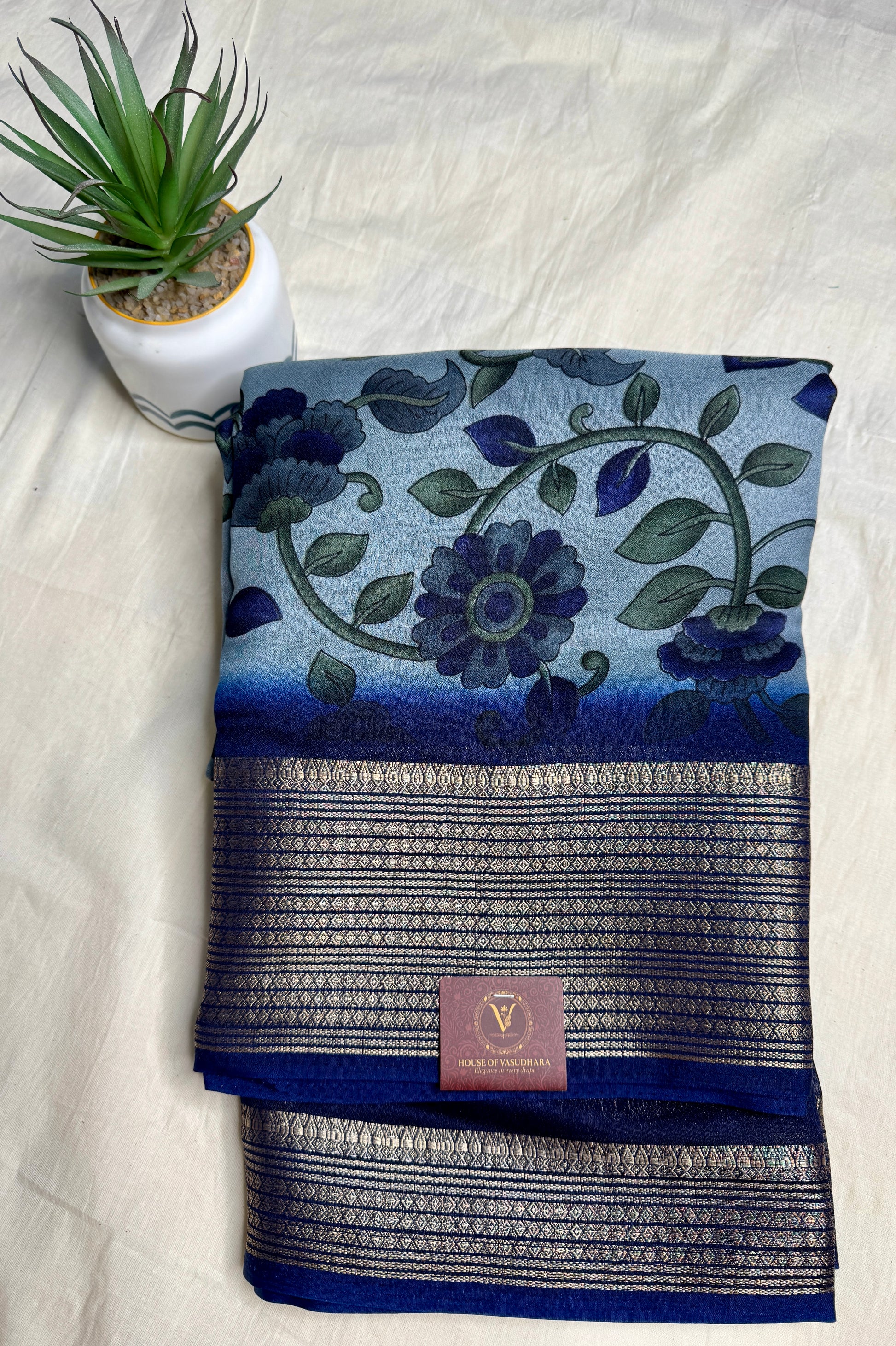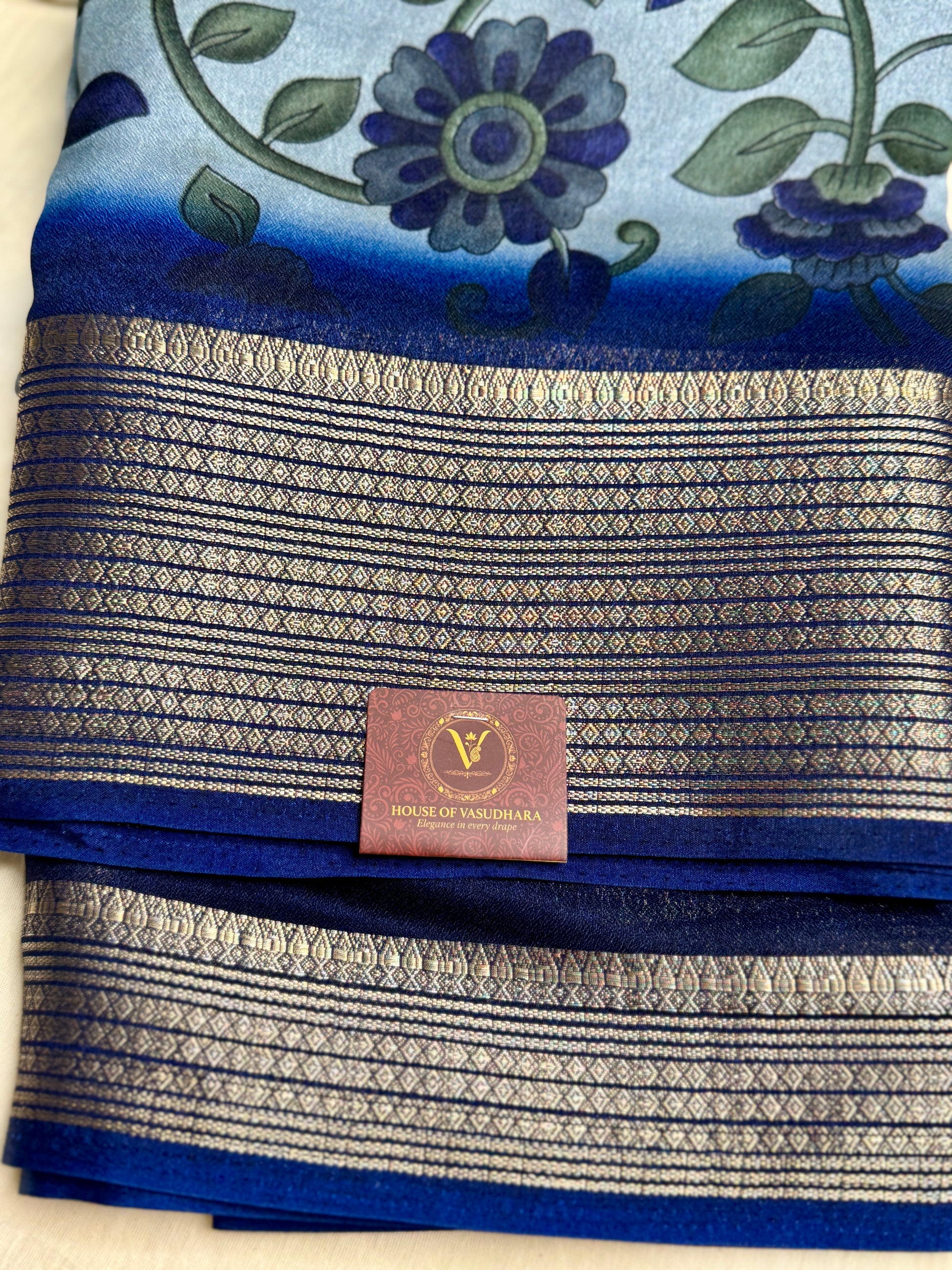 Light blue & Navy blue Meena Silk Saree with Floral creepers