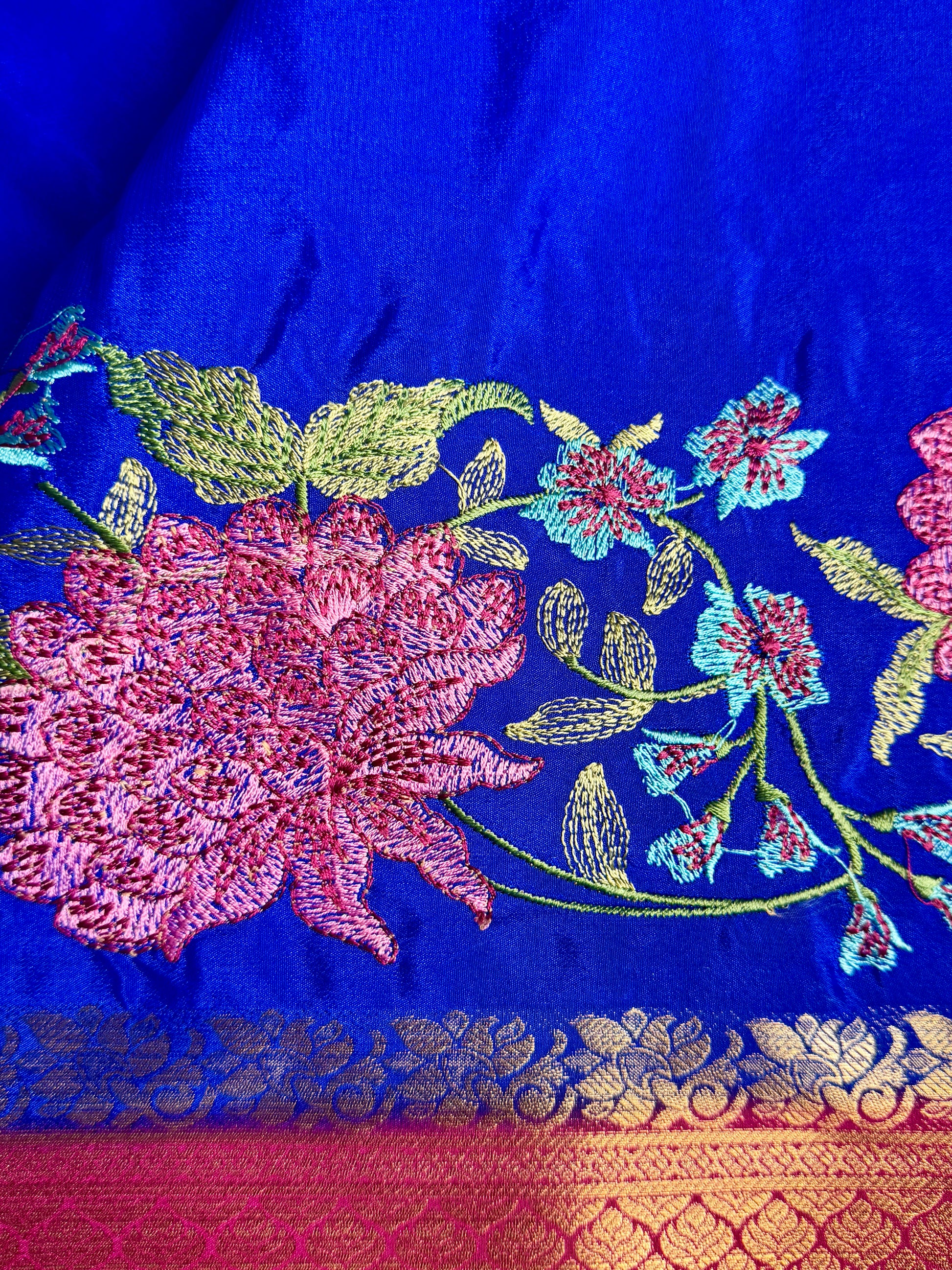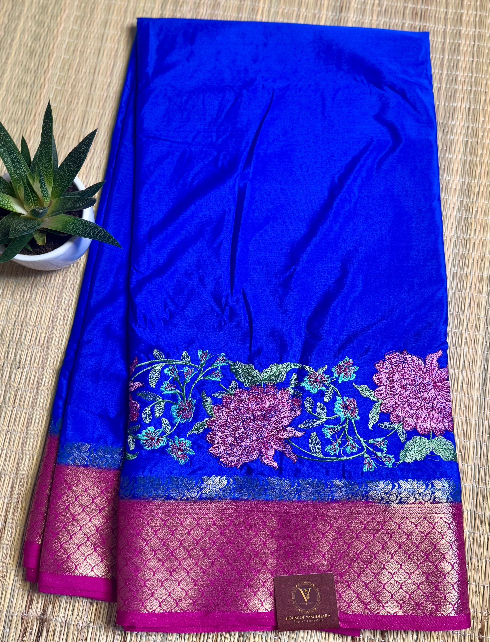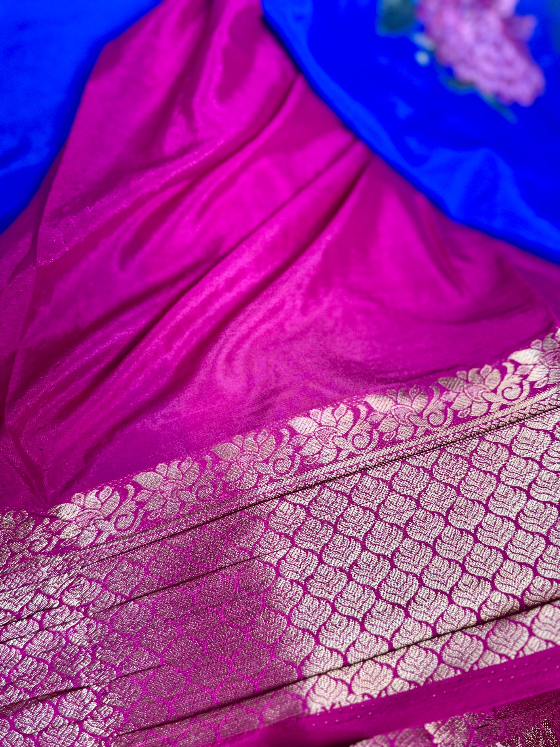 Royal Blue & Magenta Mysore Silk Crepe Saree with Intricate Thread Embroidery