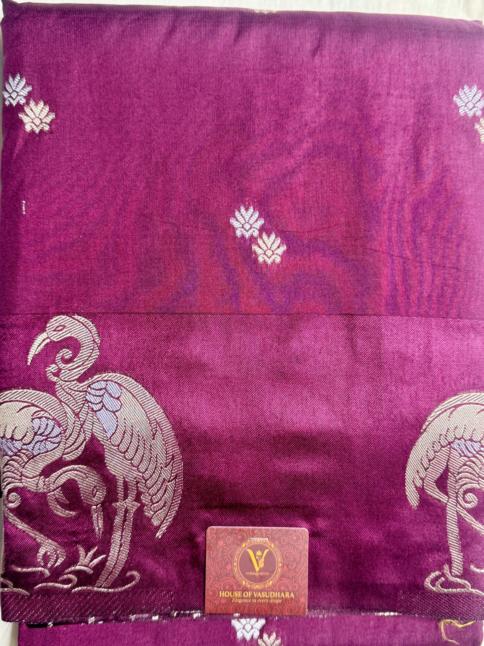 Design :Subtle all-over motifs in zari thread work. Prominent woven flamingo in Border done in shimmering silver zari — adds uniqueness and sophistication.The flamingo motif is a unique twist. Pallu is heavily adorned with intricate silver zari work. It has Geometric floral and temple motifs in a richly woven pattern.