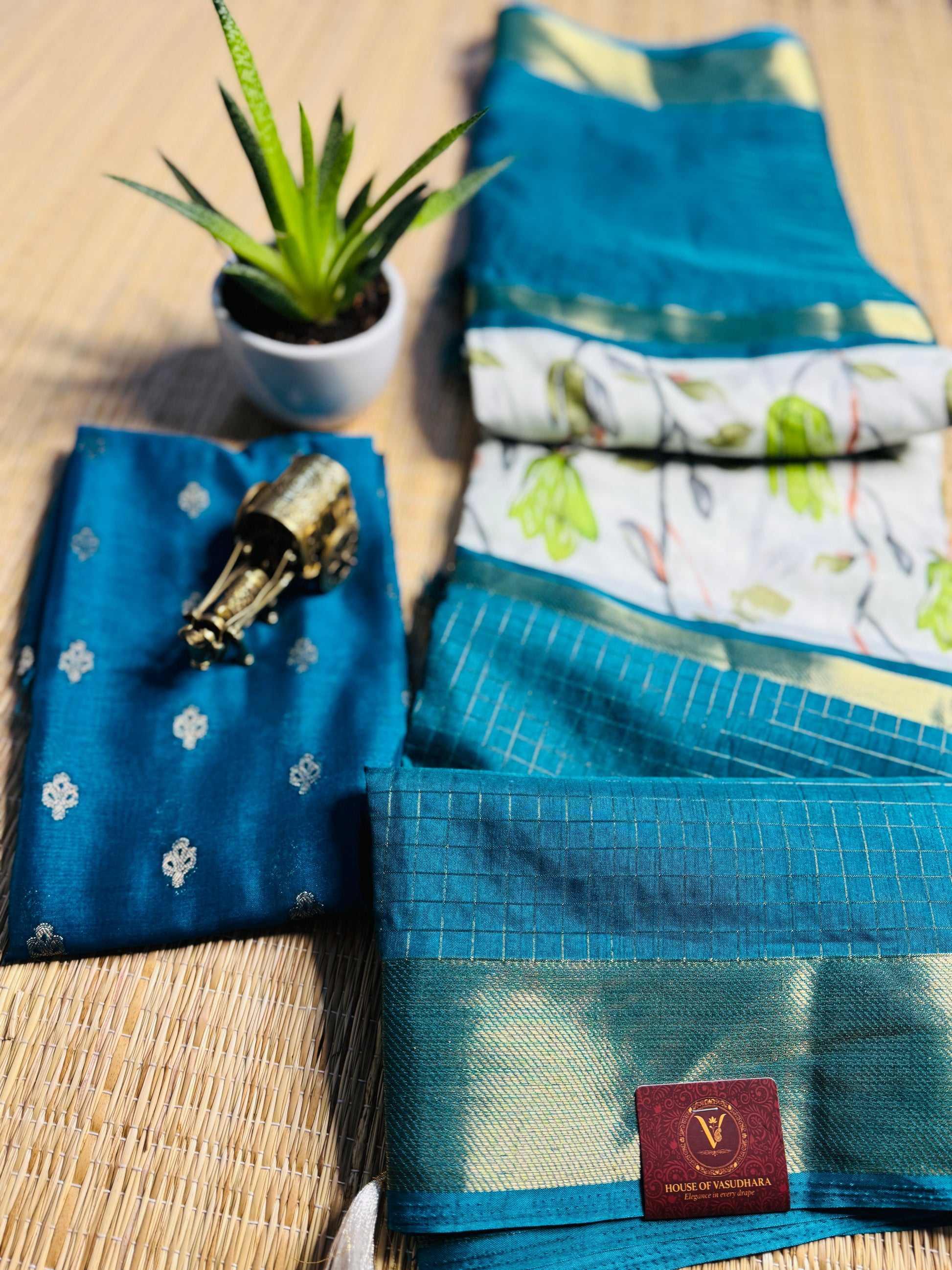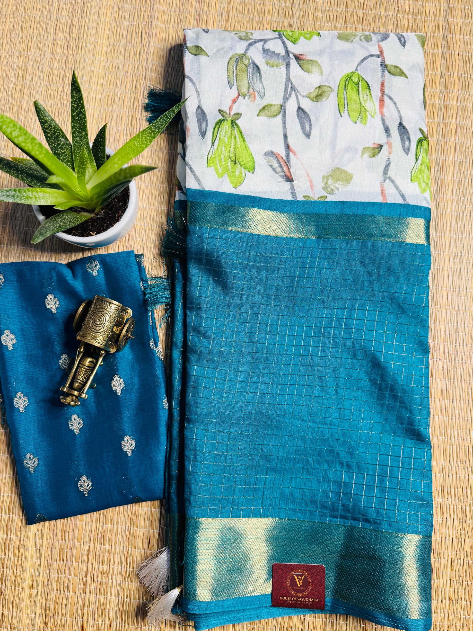 - Design : Half and Half pattern. Zari border with small checks and floral print all over the Body With checked Pallu & buttas on Blouse.