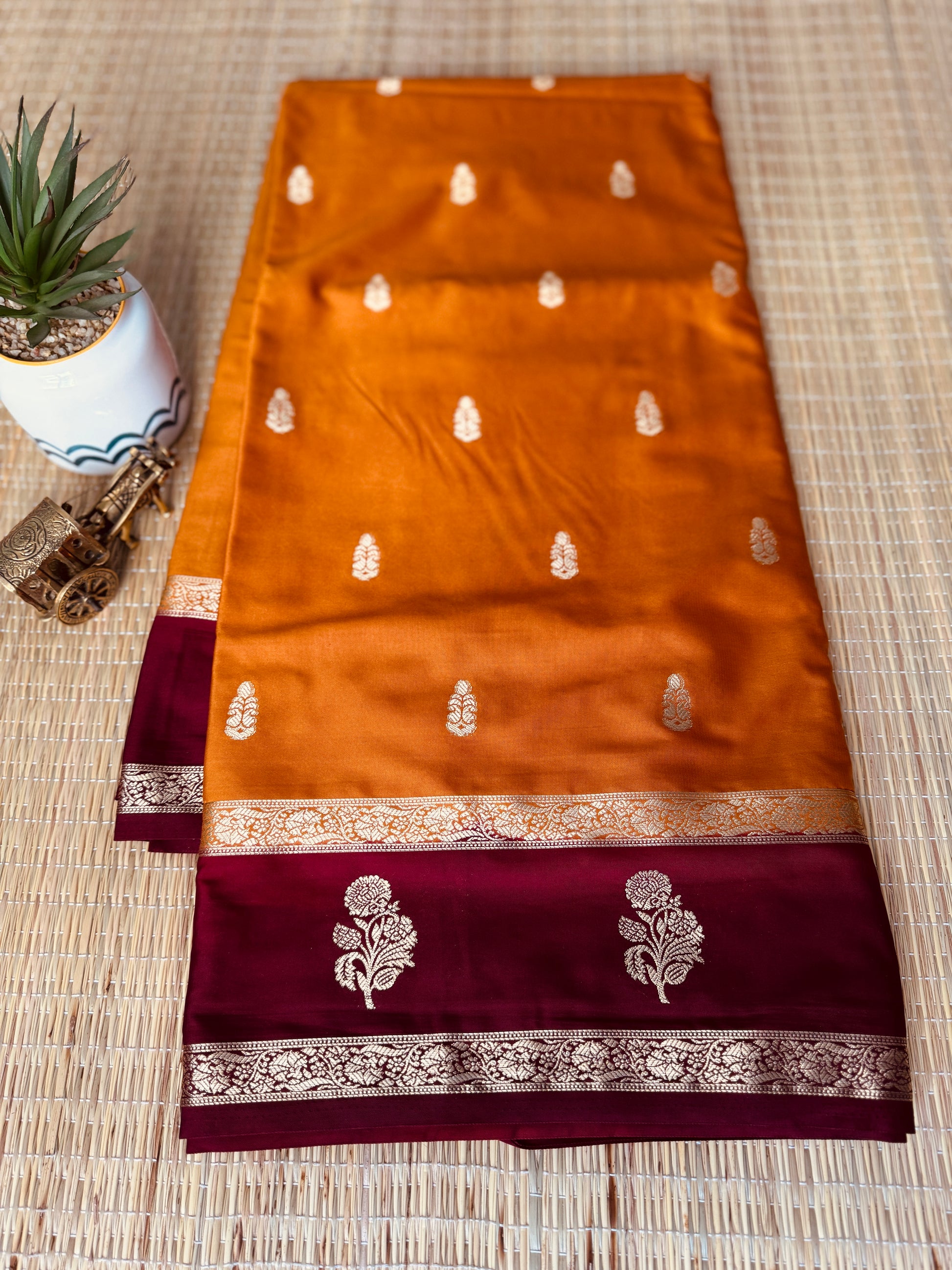 Mustard Yellow and Brown Semi Mysore silk Crepe Saree with Bentex border