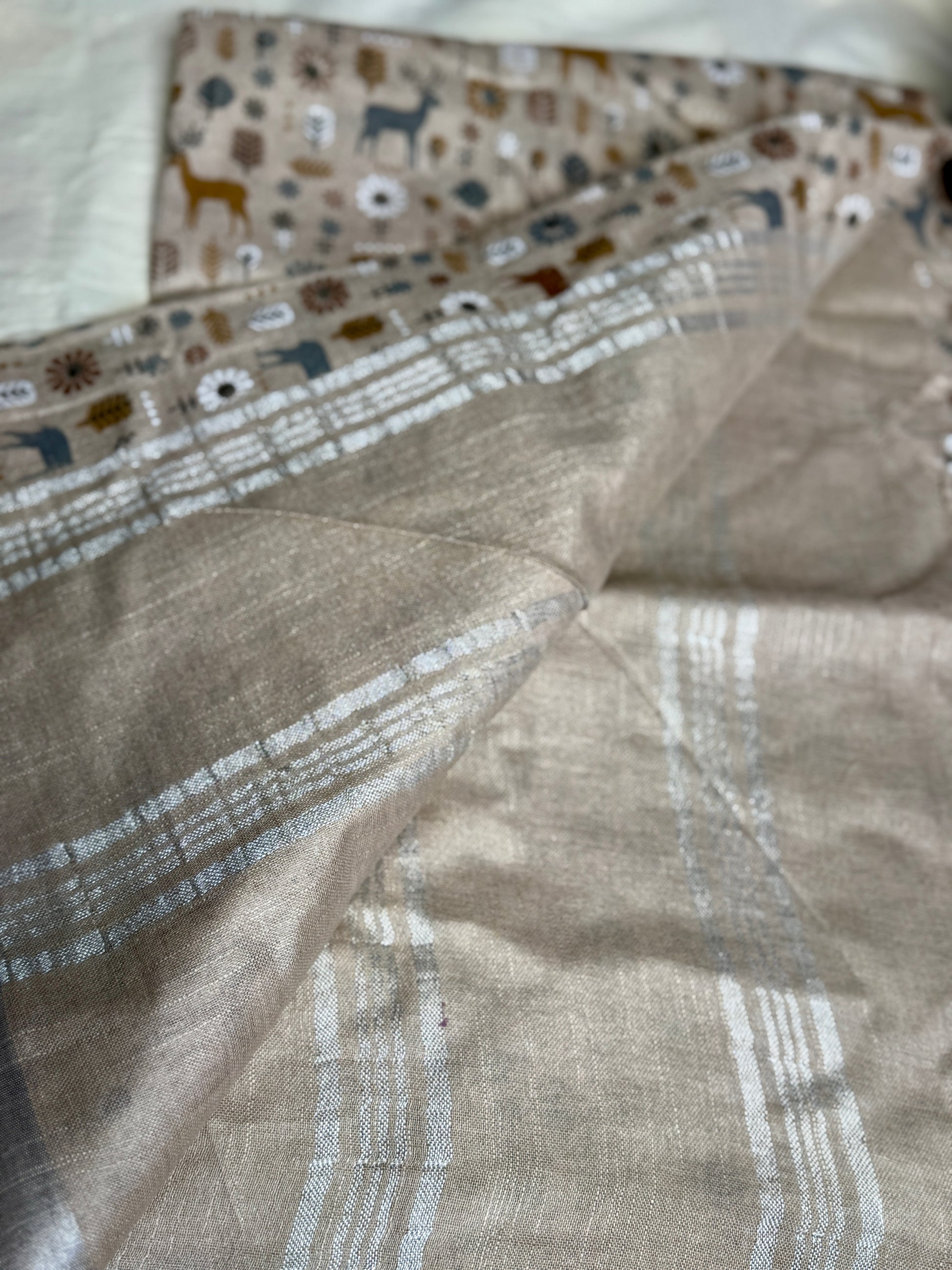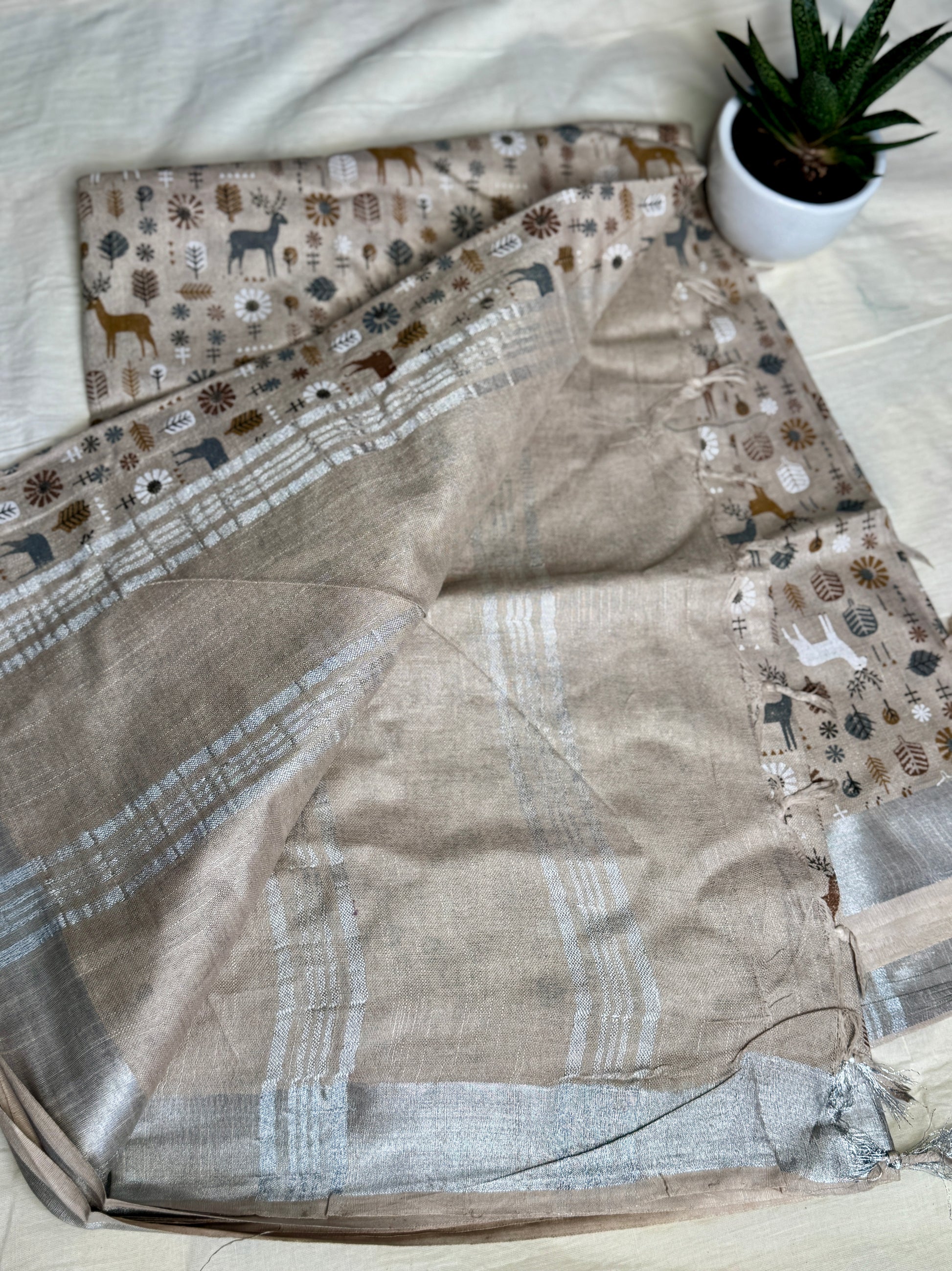 Design: This traditional hand block print saree features an enchanting digital print adorned with delicate deer, floral, and leaf motifs , beautifully spread across the body for a whimsical woodland look.