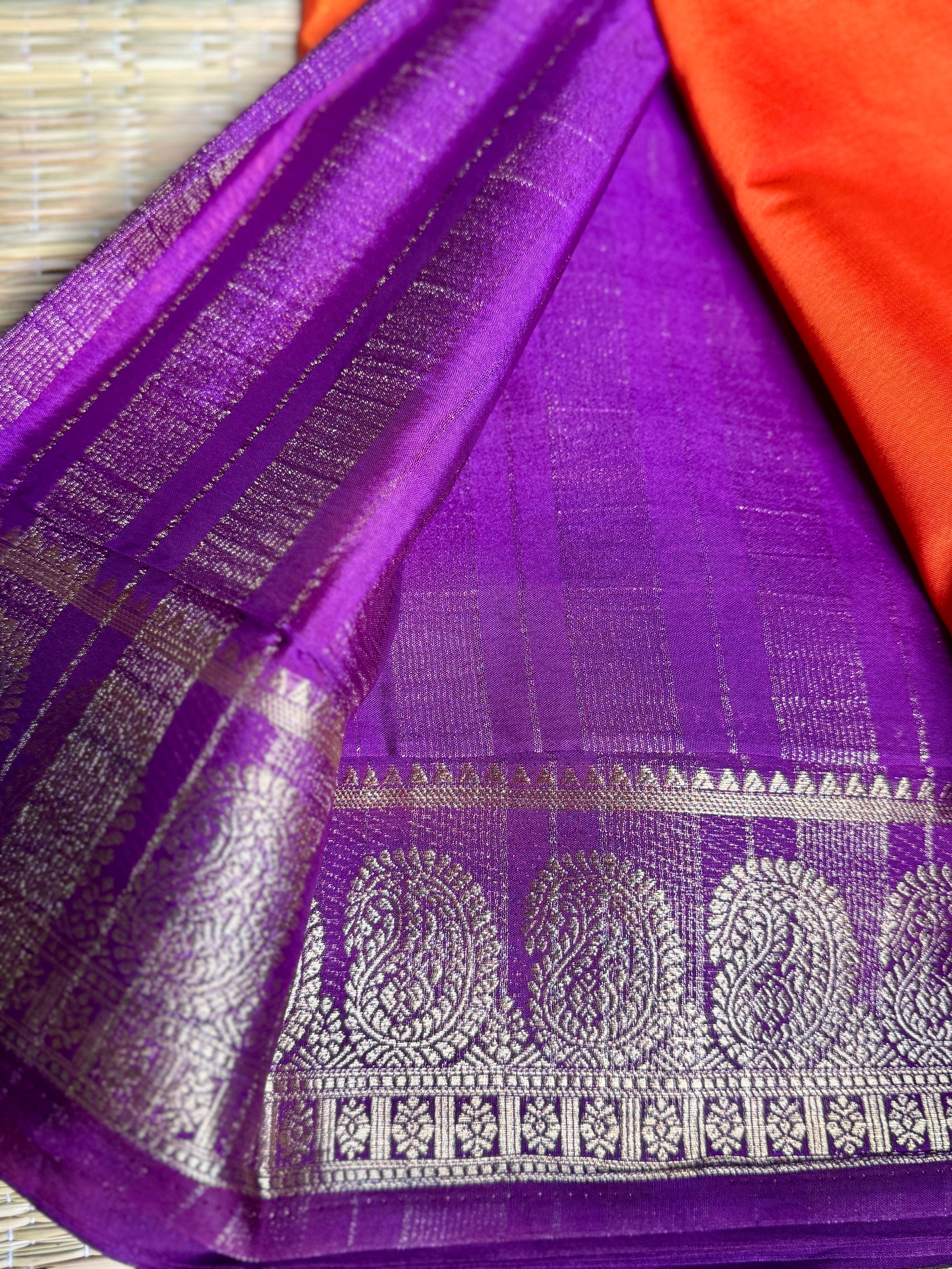 Border: Contrast with intricate gold zari Mango border, including paisley and temple-style edging.