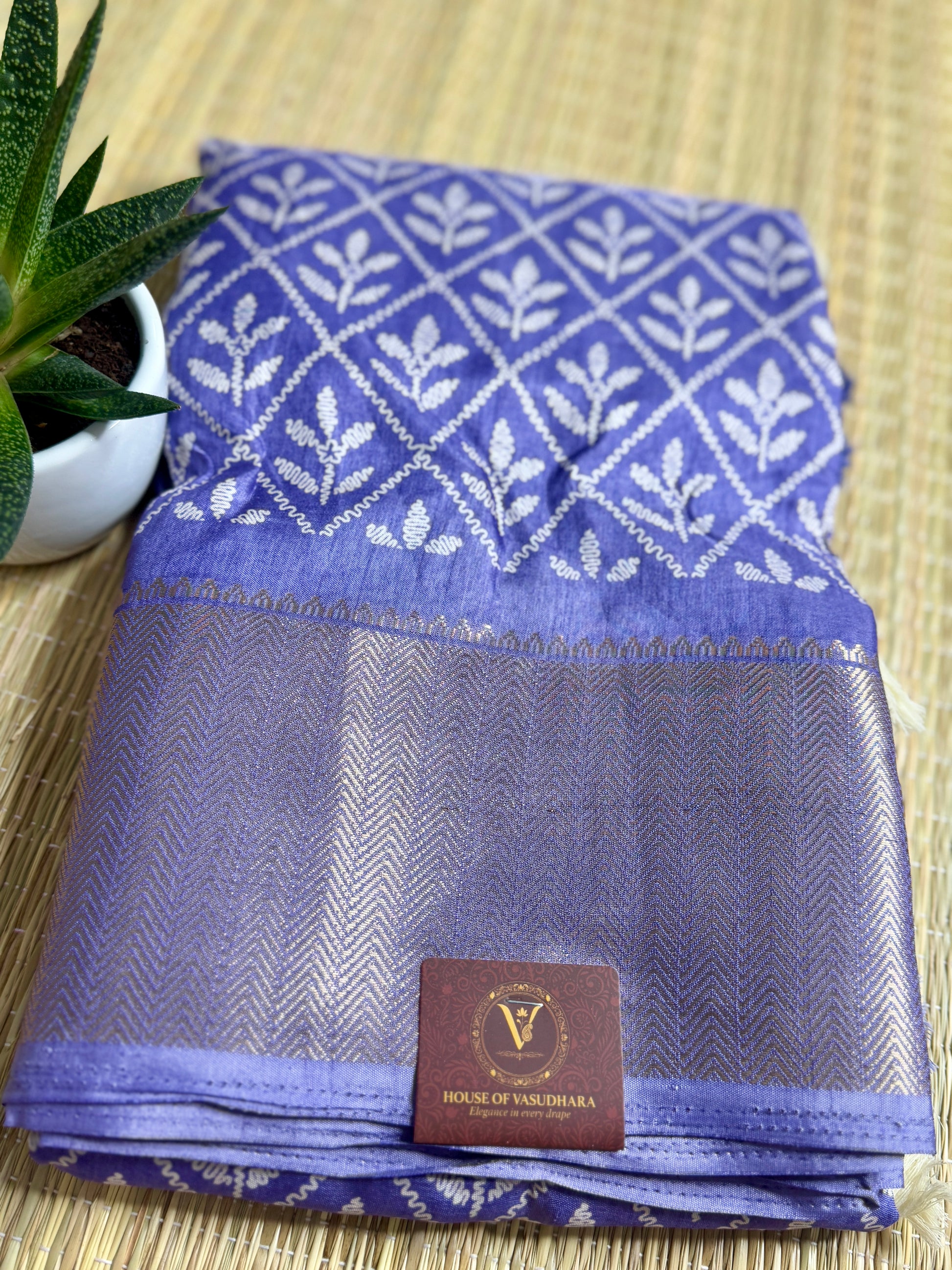 Pallu : The Pallu showcases a geometric floral trellis pattern, Big Mango Motifs adding texture and depth. It ends with playful tassels