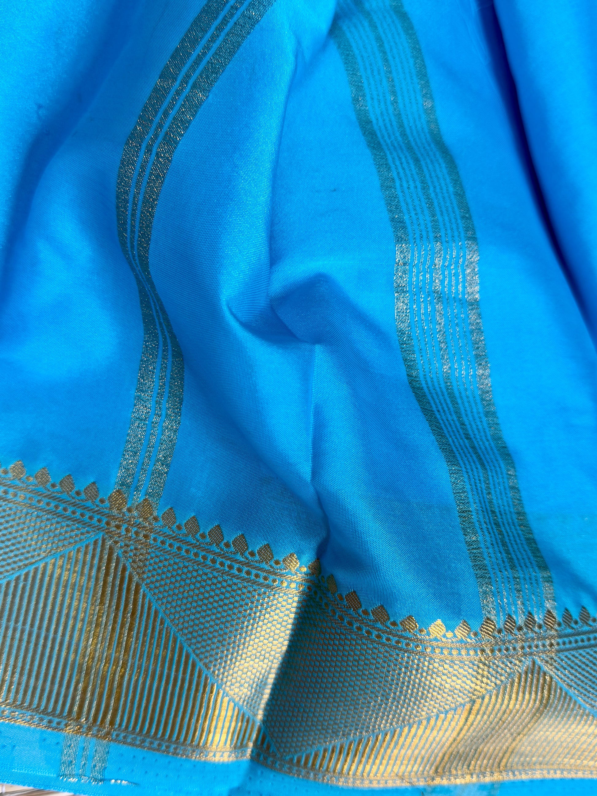Pallu: The pallu features a stunning intricate gold zari in Stripes. Its lustrous sheen and elegant texture add a regal finish to the saree’s drape.
