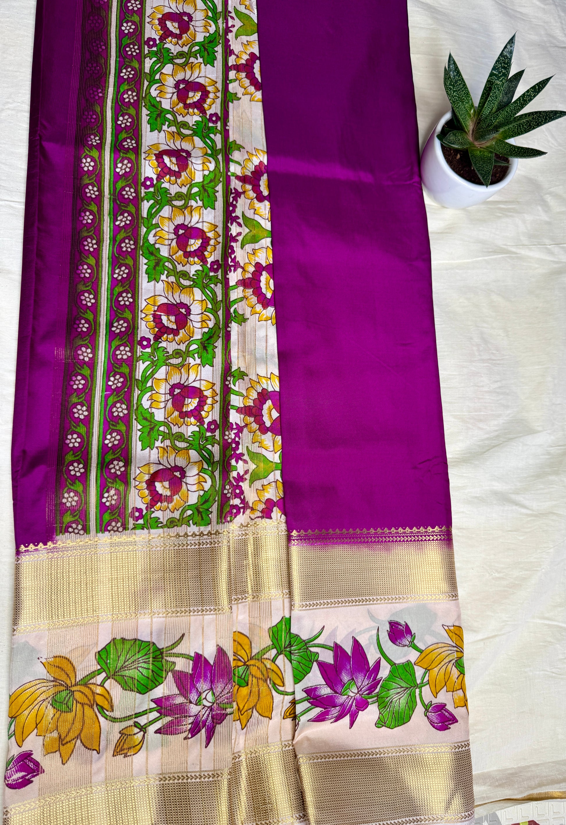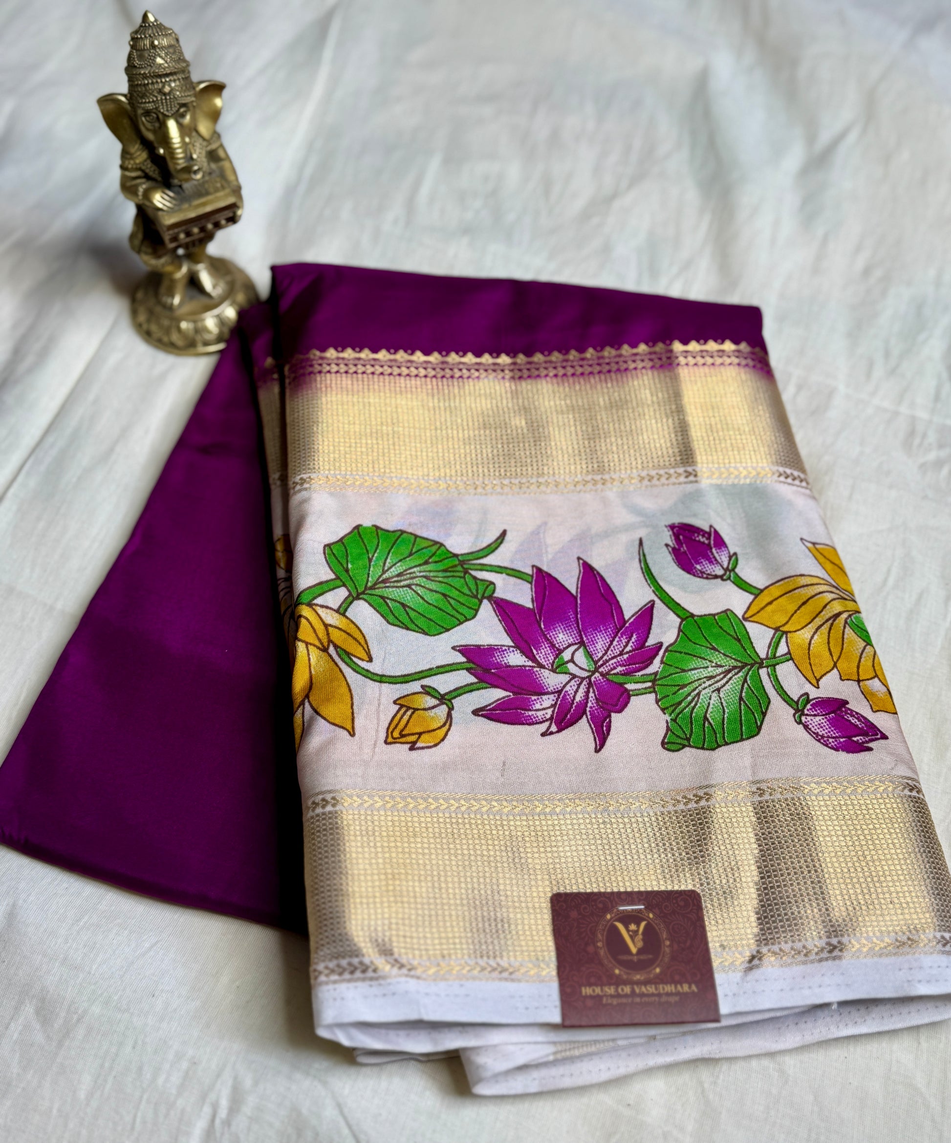 The saree features a smooth, lustrous body paired with a gracefully printed bold floral artistry in Bentex border. The exquisite floral design lends a refreshing aesthetic that strikes a balance between traditional charm and modern vibrancy.