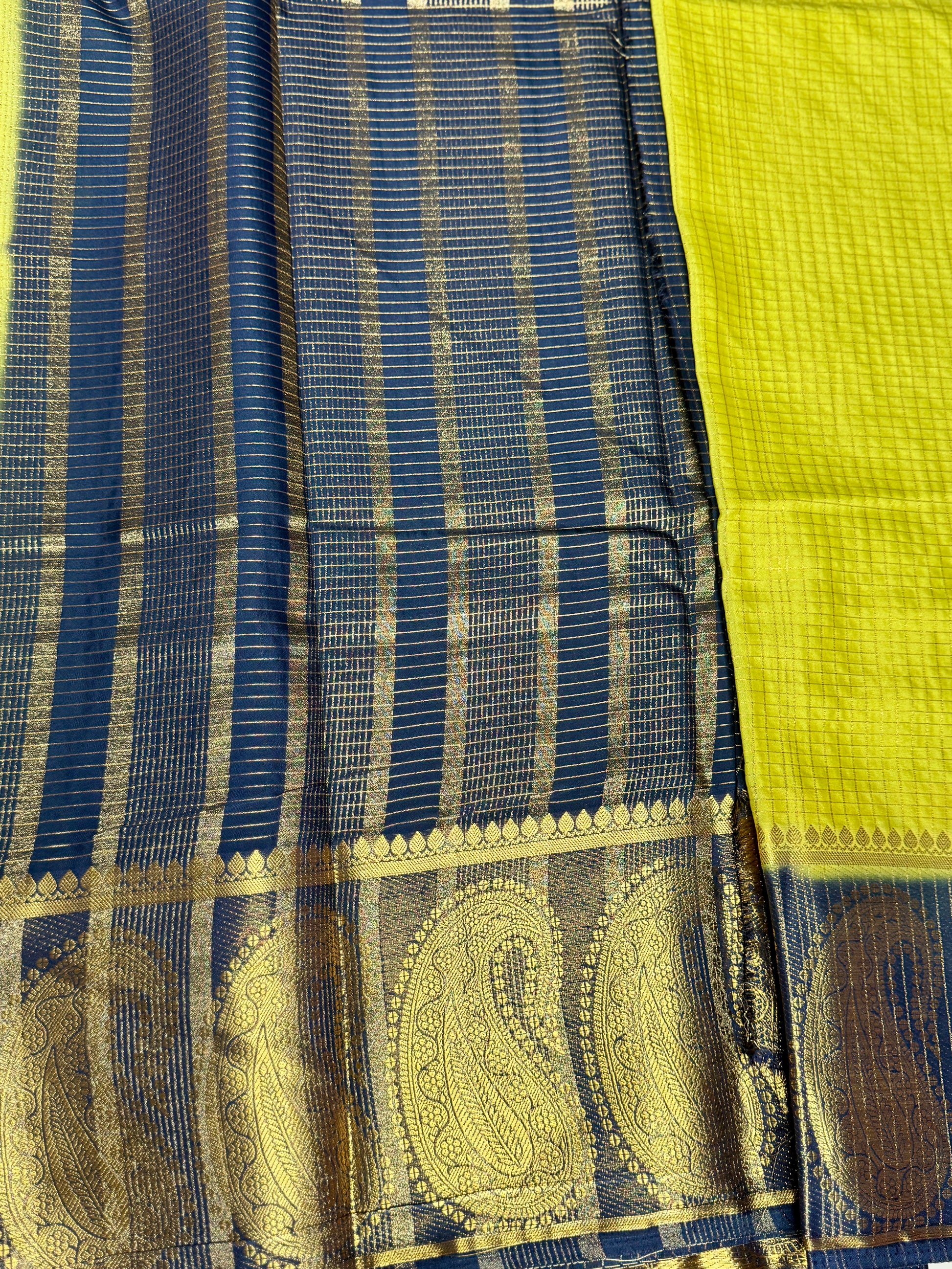 This Saree has a Radiating traditional charm with a touch of modern finesse.The Body has subtle golden thread check patterns woven throughout, offering a graceful shimmer and understated texture that elevates the saree’s elegance. Border has contrasting border adorned with large paisley Mango motifs in gold zari, edged with a delicate temple design. The grandeur of the border is both bold and intricate, giving a rich finish to the overall drape.
