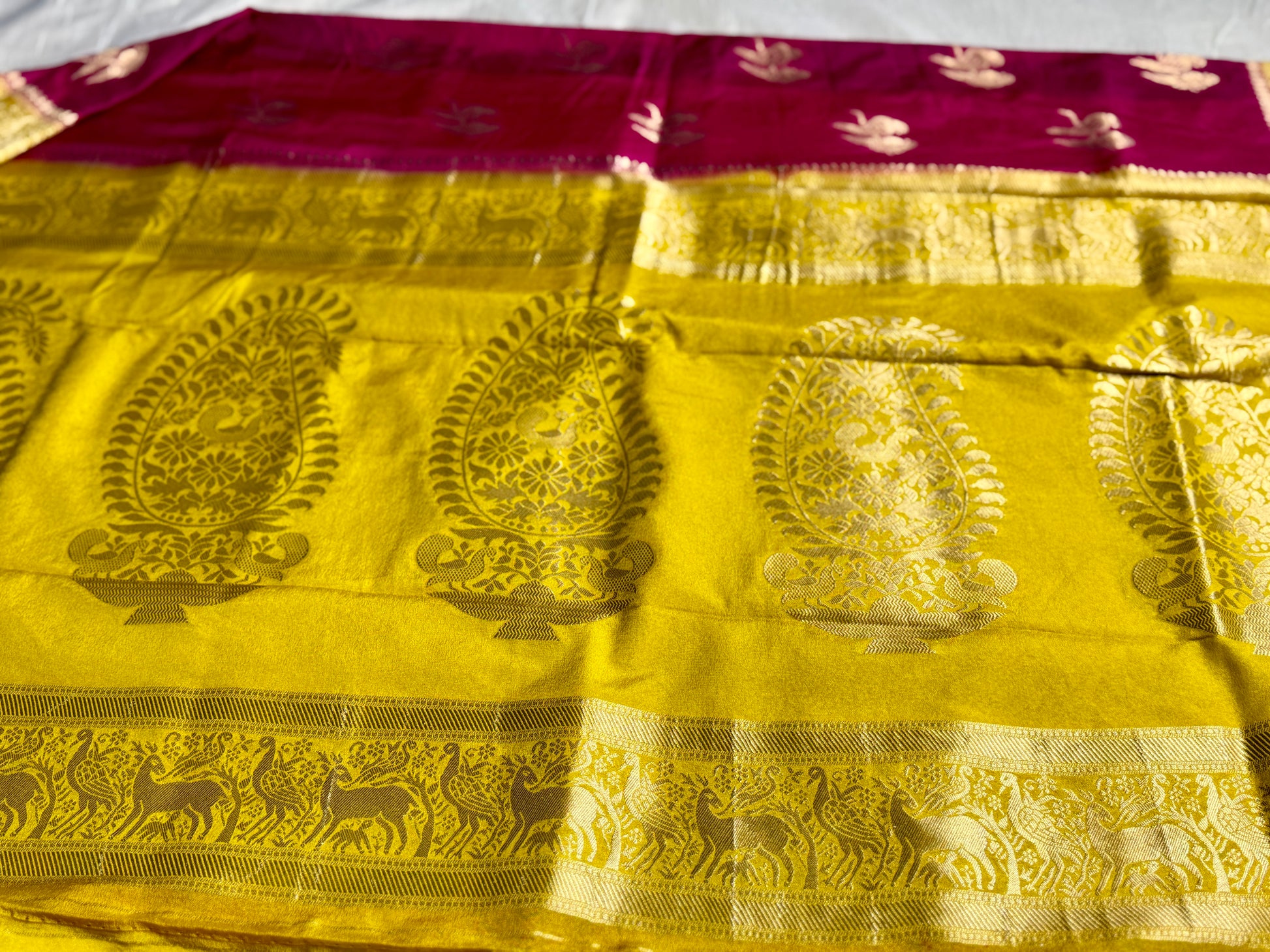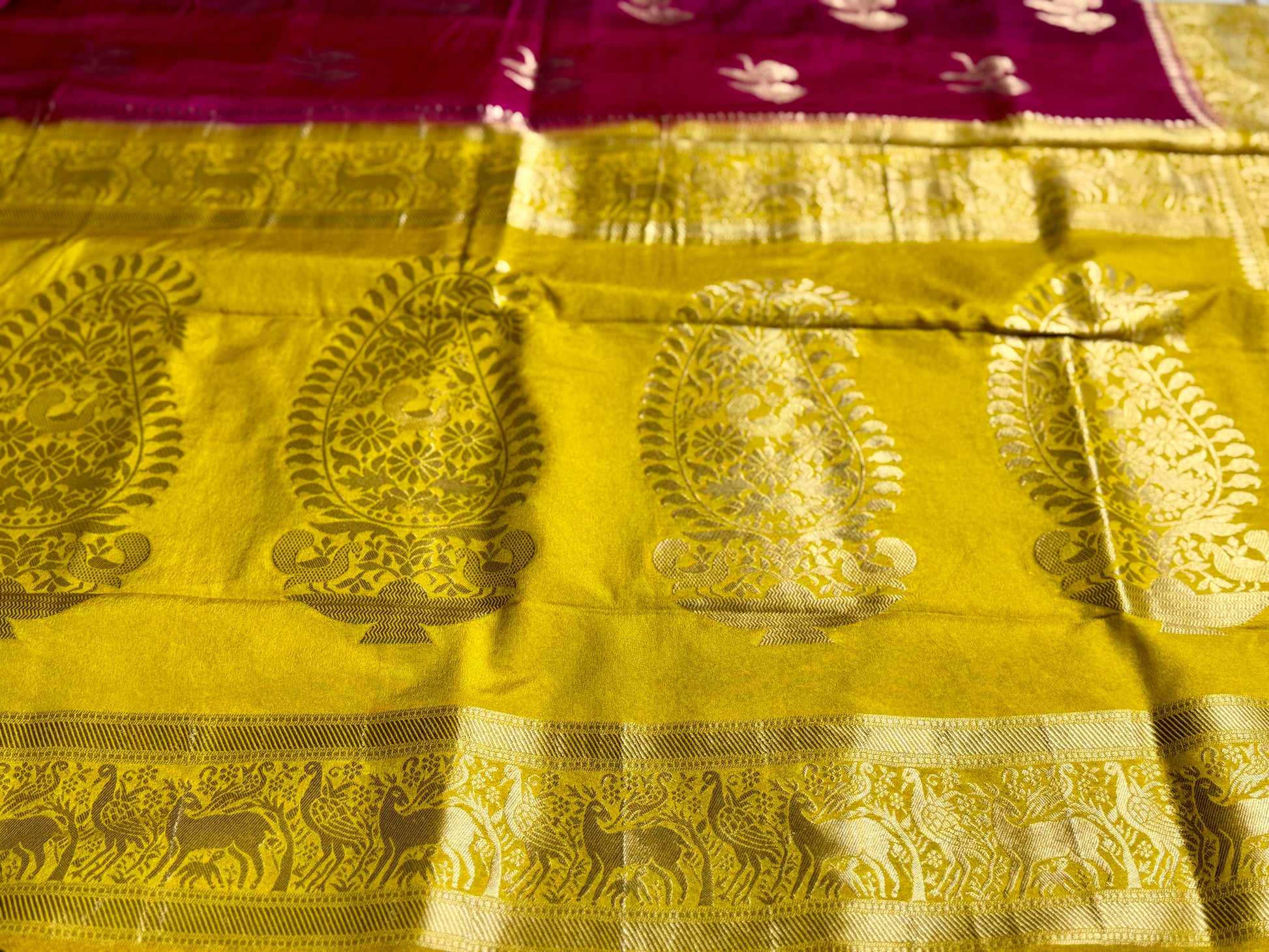 Design :Embrace timeless charm with this exquisite Khadi silk saree.The body of the saree features elegant zari parrot motifs, symbolizing beauty and grace. The border is adorned with intricate zari flora & fauna weaving, leading to a radiant Pallu embellished with bold mango (paisley) work.
