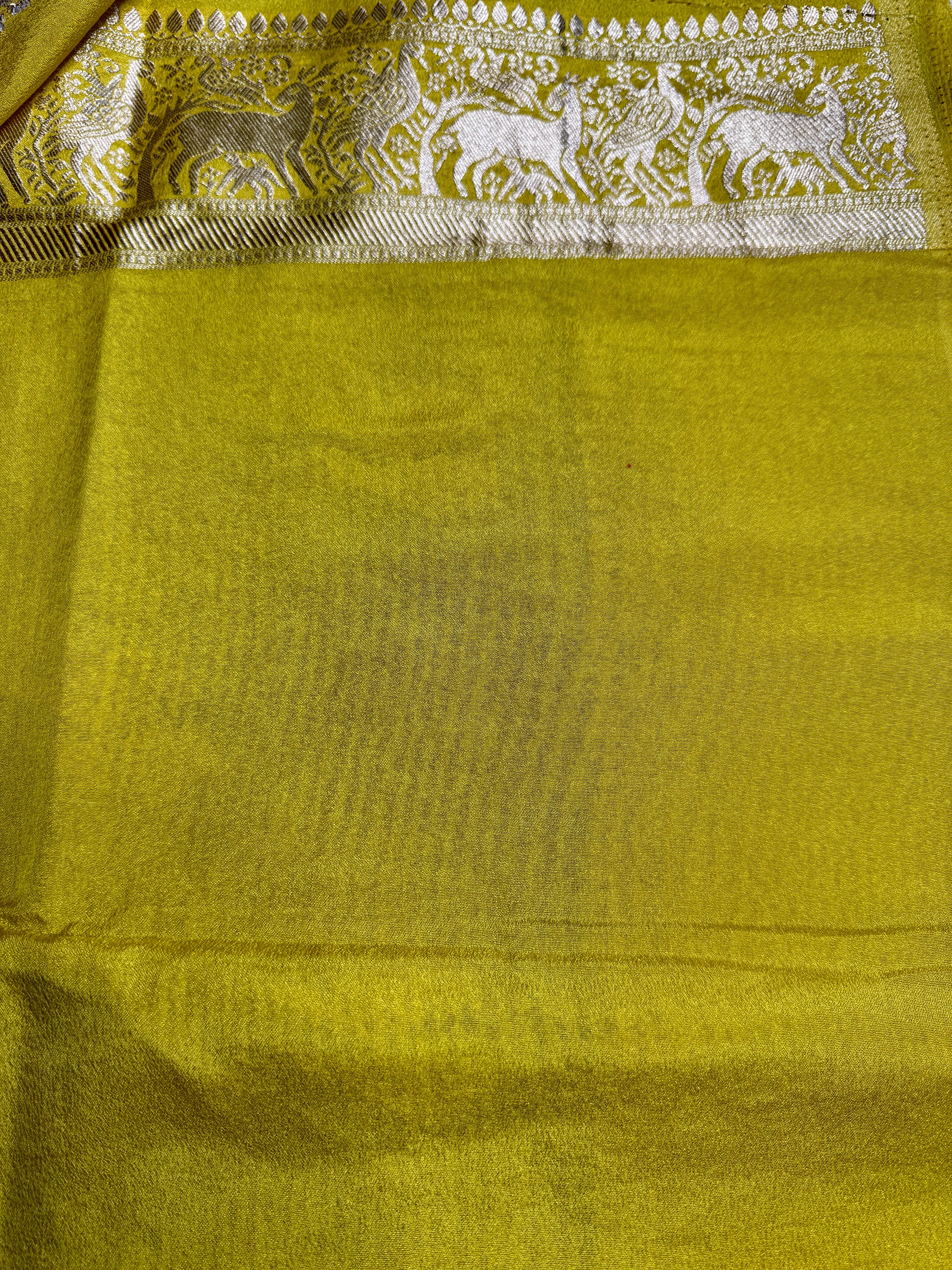 Design :Embrace timeless charm with this exquisite Khadi silk saree.The body of the saree features elegant zari parrot motifs, symbolizing beauty and grace. The border is adorned with intricate zari flora & fauna weaving, leading to a radiant Pallu embellished with bold mango (paisley) work.