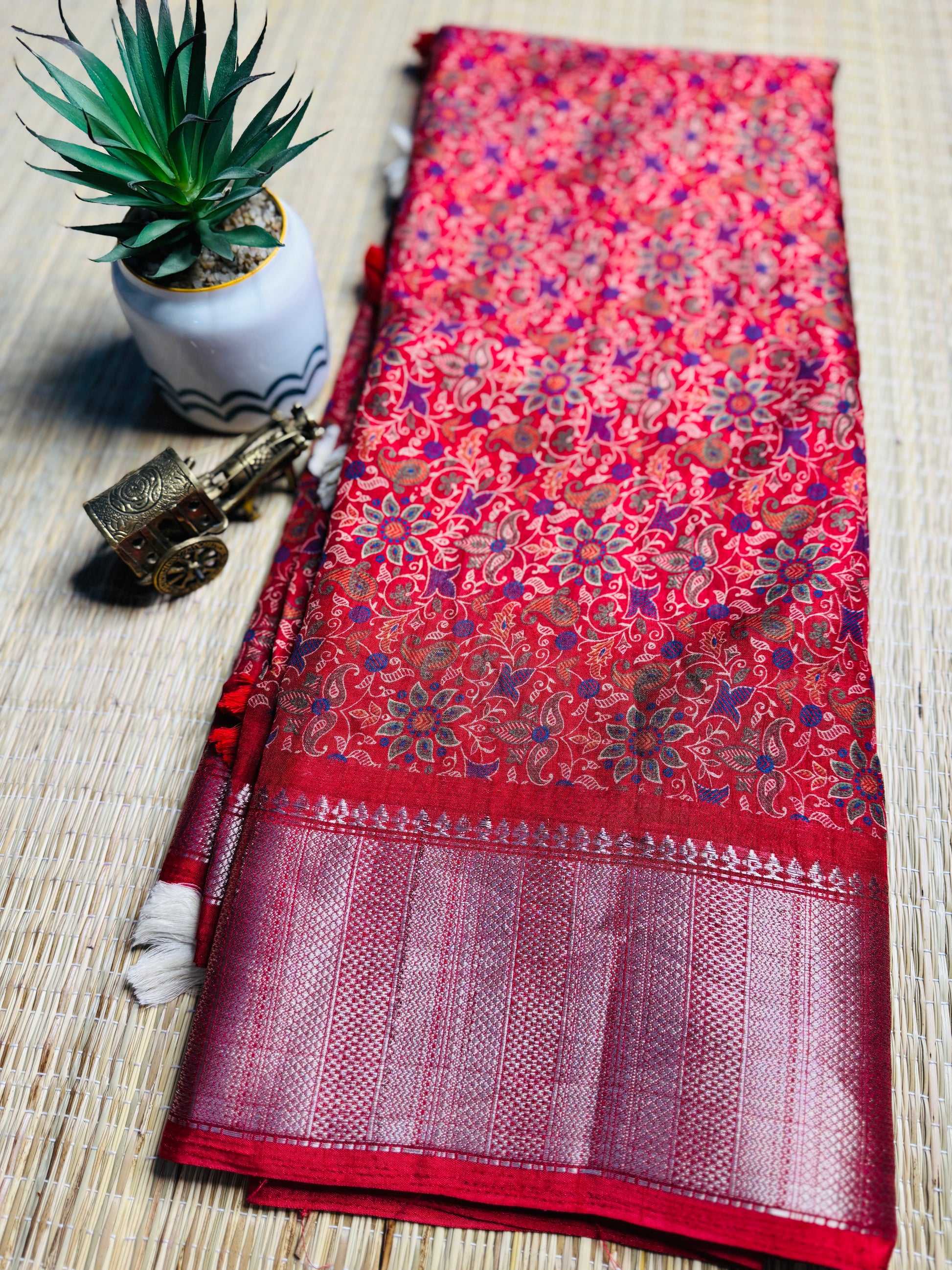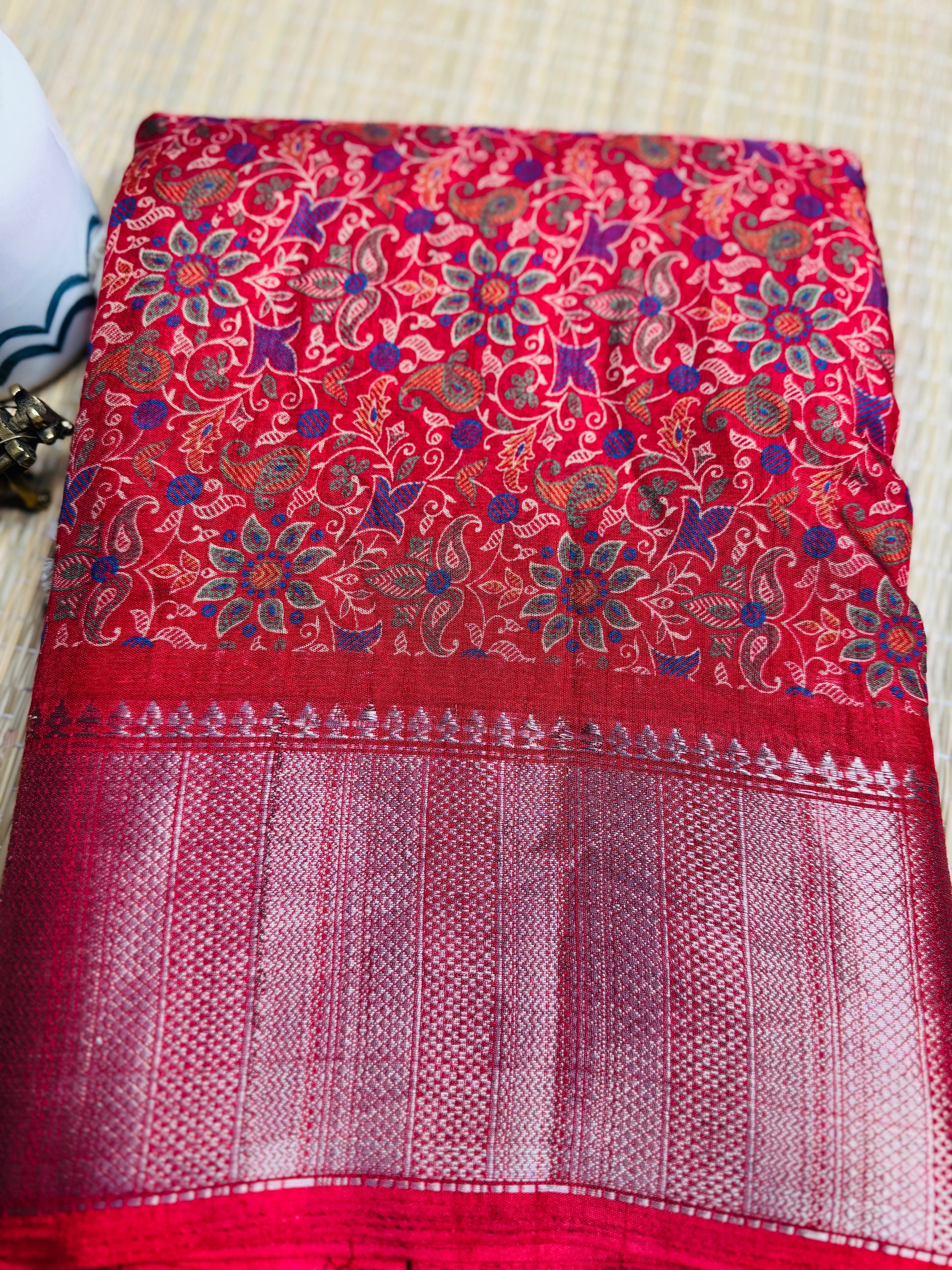 Design : This exquisite dola silk saree features intricate white Leafy floral vine print, blending traditional charm with refined elegance. The body is adorned with alternating paisley and leafy vine motifs.The soft sheen of dola silk enhances its graceful drape, making it perfect for festive and special occasions.
