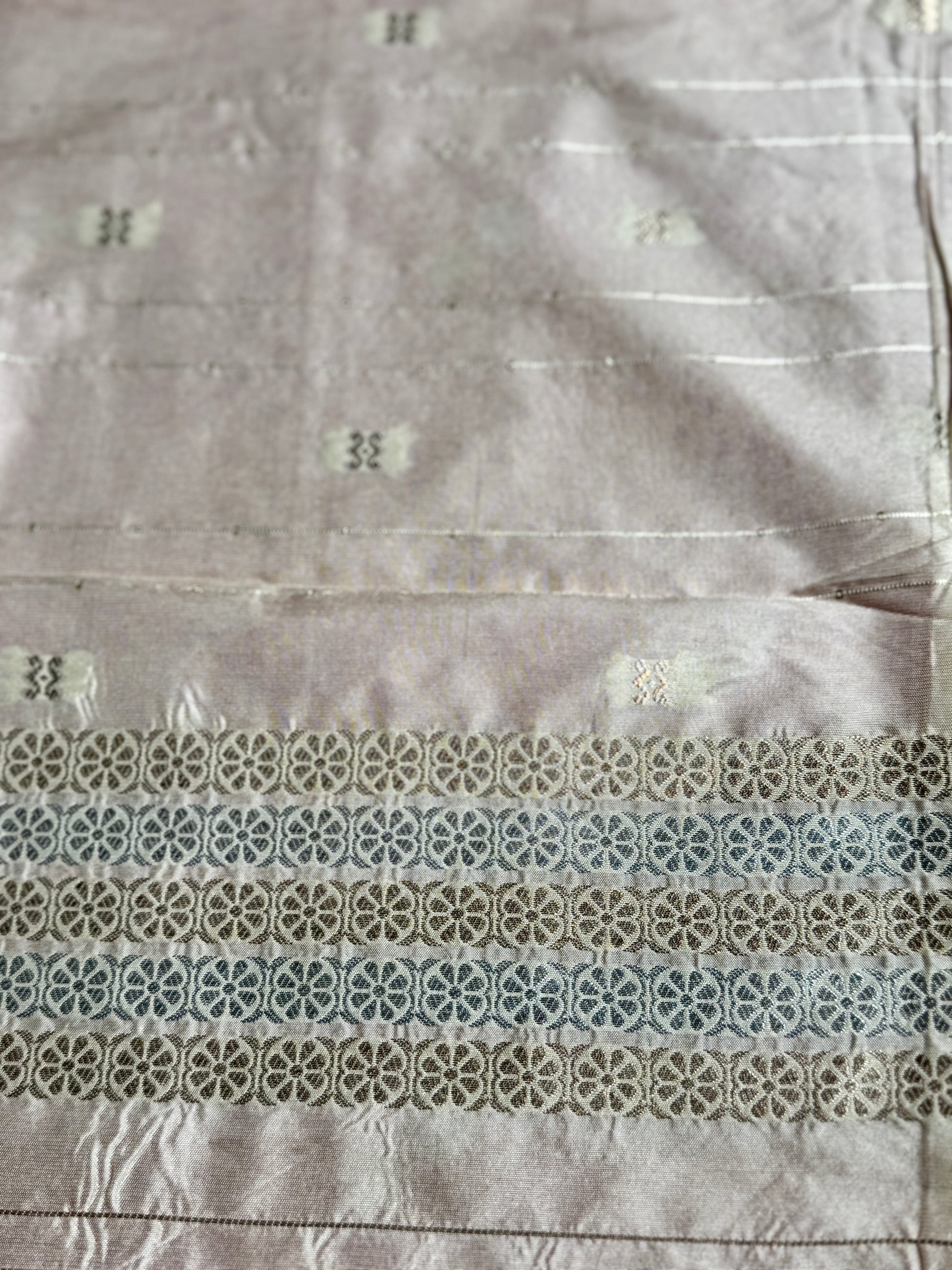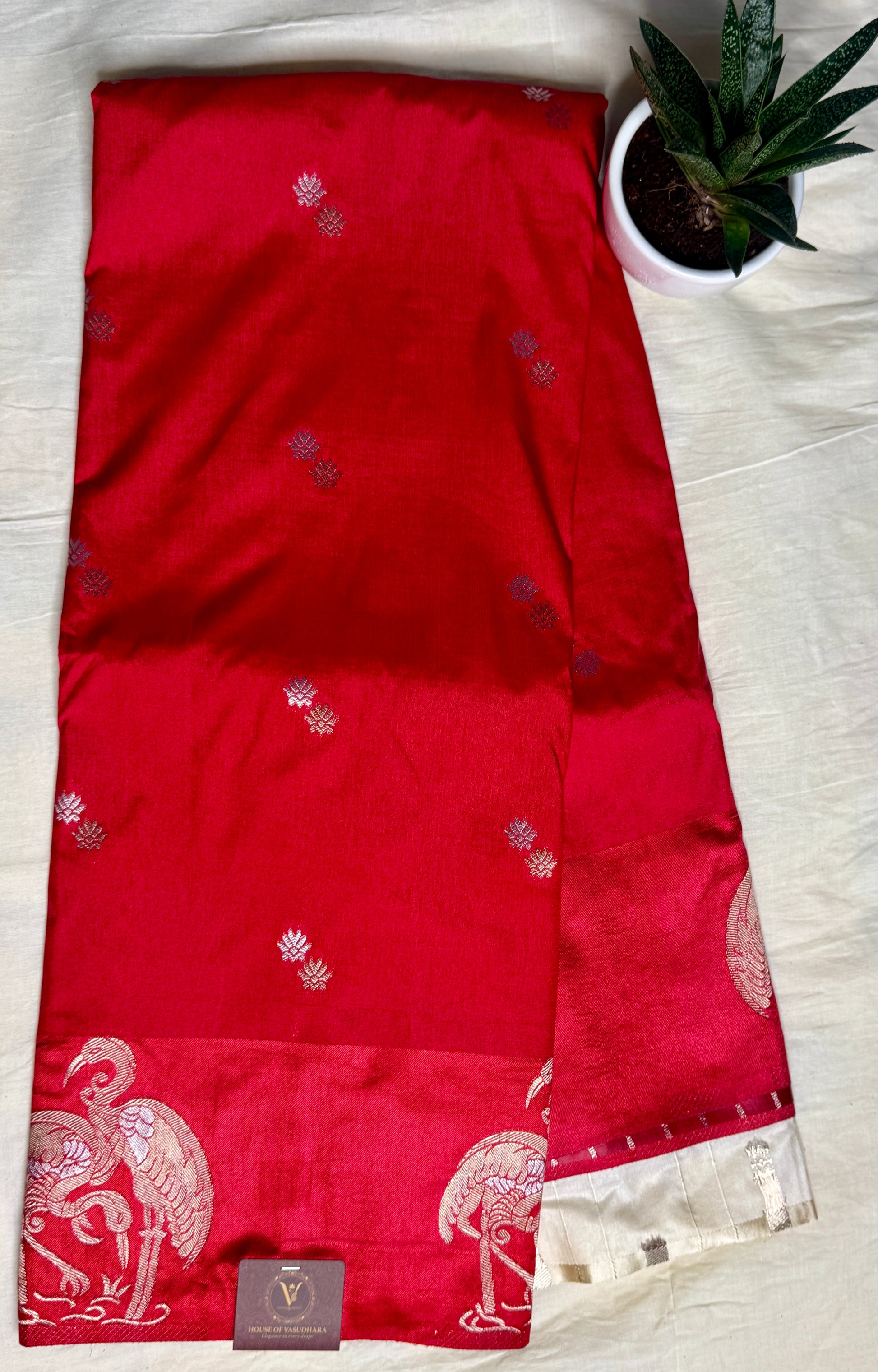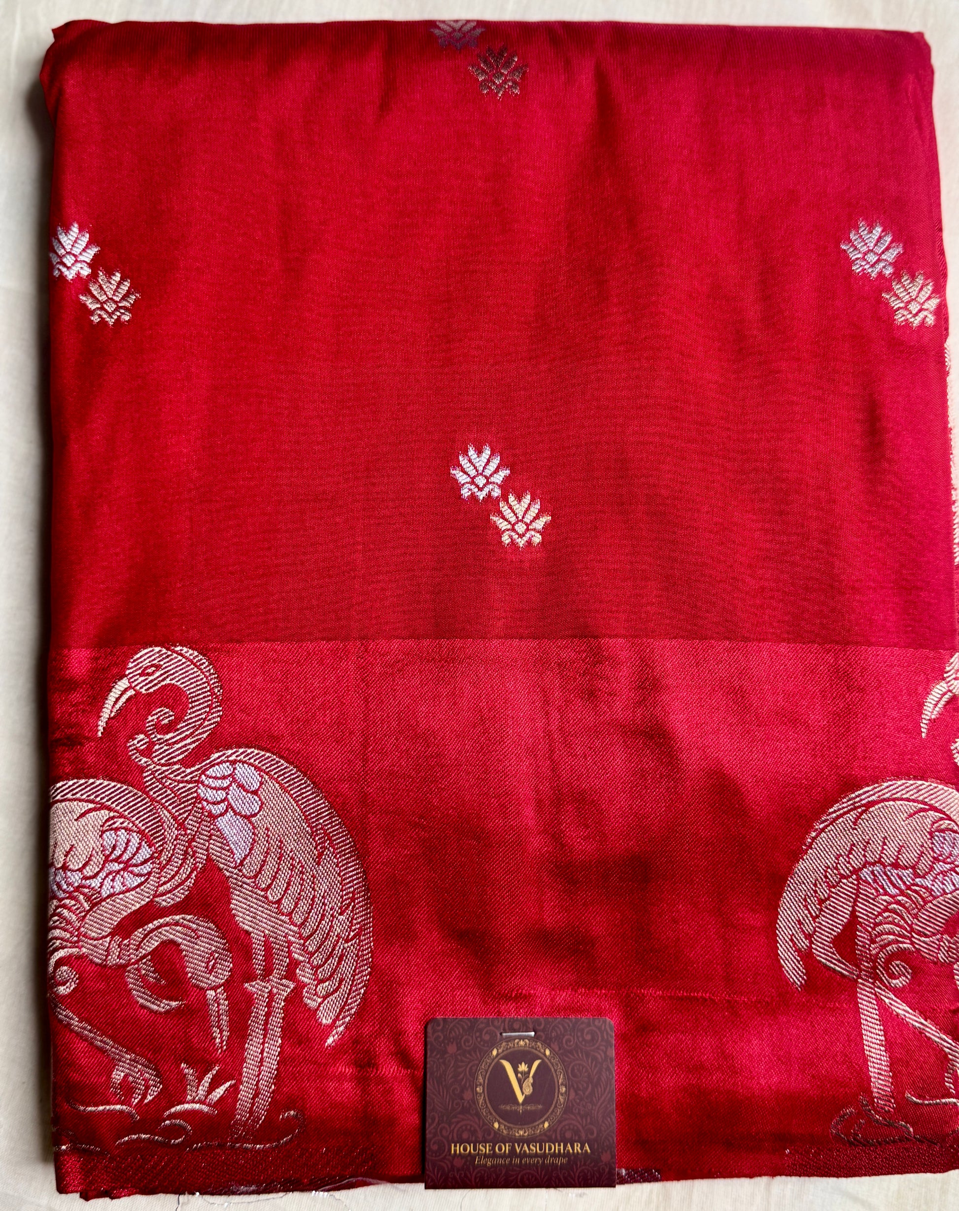 Design :Subtle all-over motifs in zari thread work. Prominent woven flamingo in Border done in shimmering silver zari — adds uniqueness and sophistication.The flamingo motif is a unique twist. Pallu is heavily adorned with intricate silver zari work. It has Geometric floral and temple motifs in a richly woven pattern.