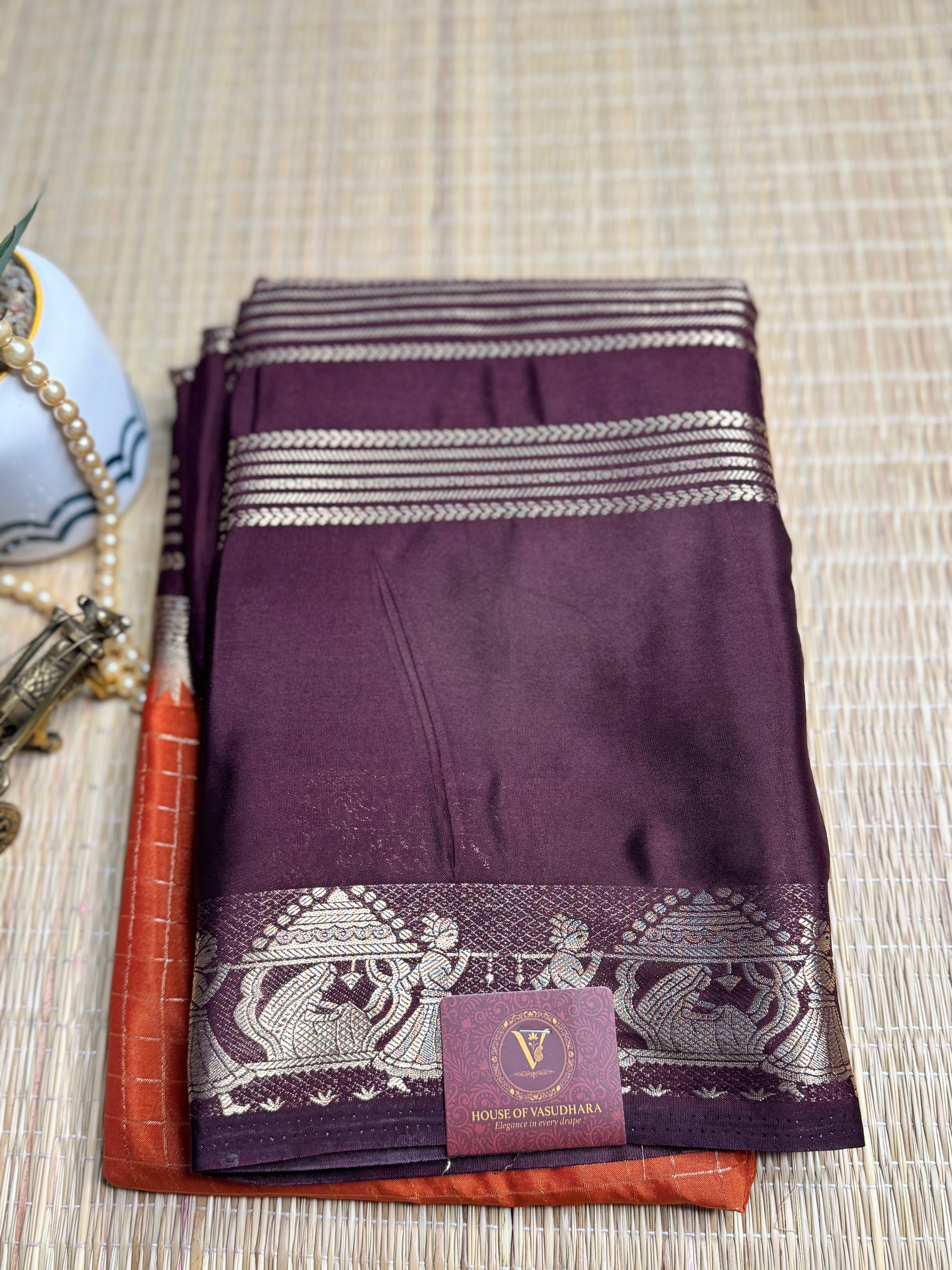Contrast brown blouse featuring coordinated woven detailing and a matching zari border.