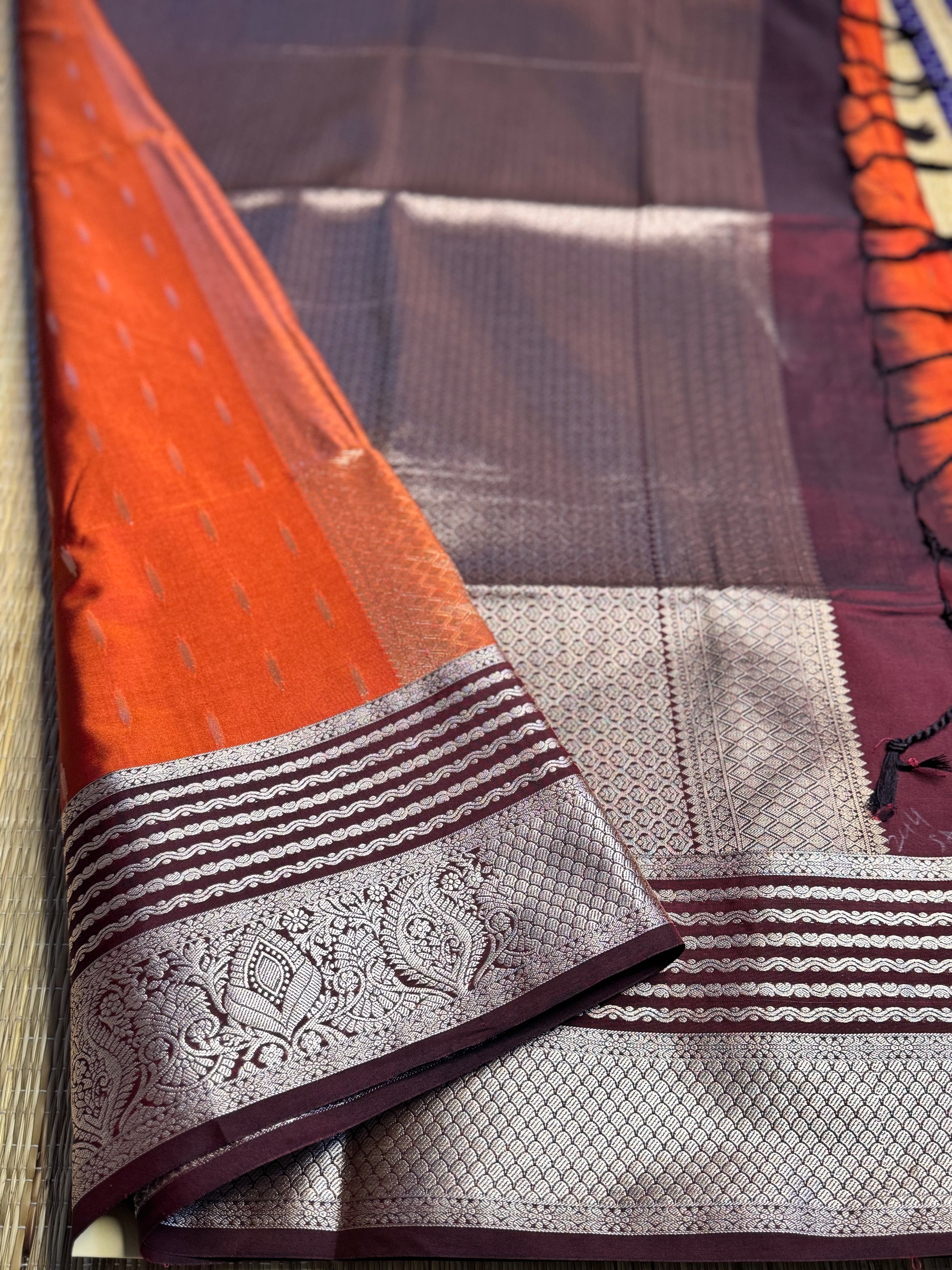 The saree features a rich Orange body adorned with subtle woven buttas, giving it a refined and elegant Kanchi-inspired look. It is beautifully complemented by a deep brown contrast border intricately woven with silver zari floral and geometric motifs. The Brown pallu, highlighted with detailed silver zari patterns, adds depth, richness, and a graceful finish to the drape.