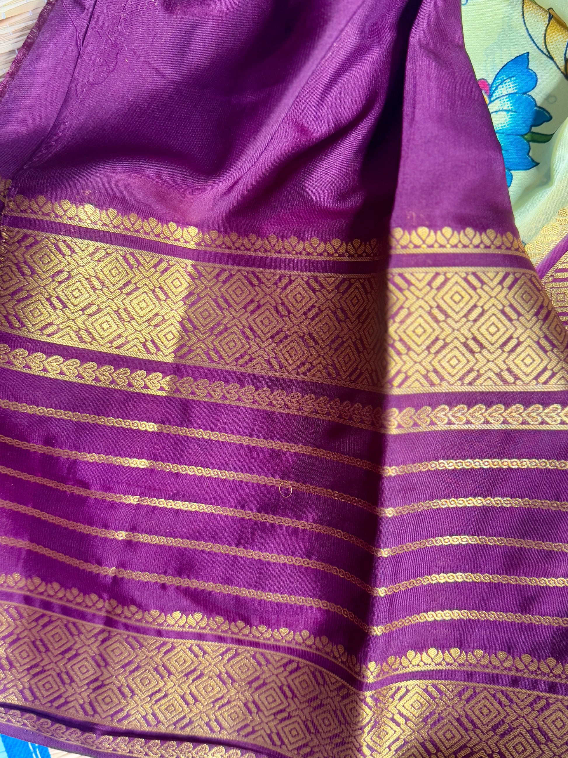 Blouse : Contrast color blouse with Border featuring traditional diamond and leaf motifs.