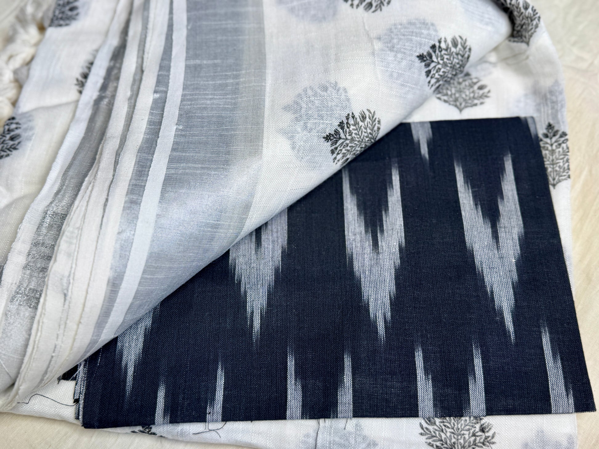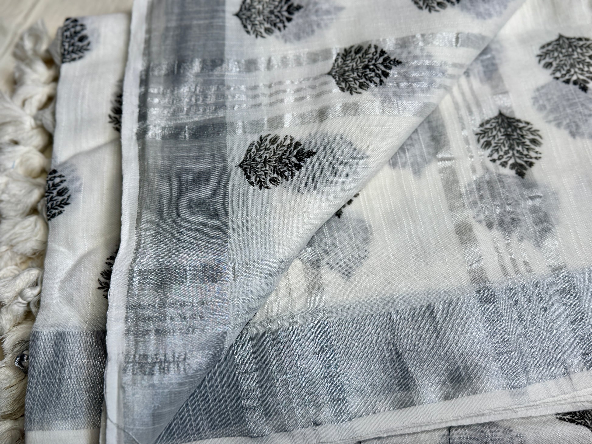 Border & Pallu: Elegant silver zari Border and Handblock-printed monochrome Pallu