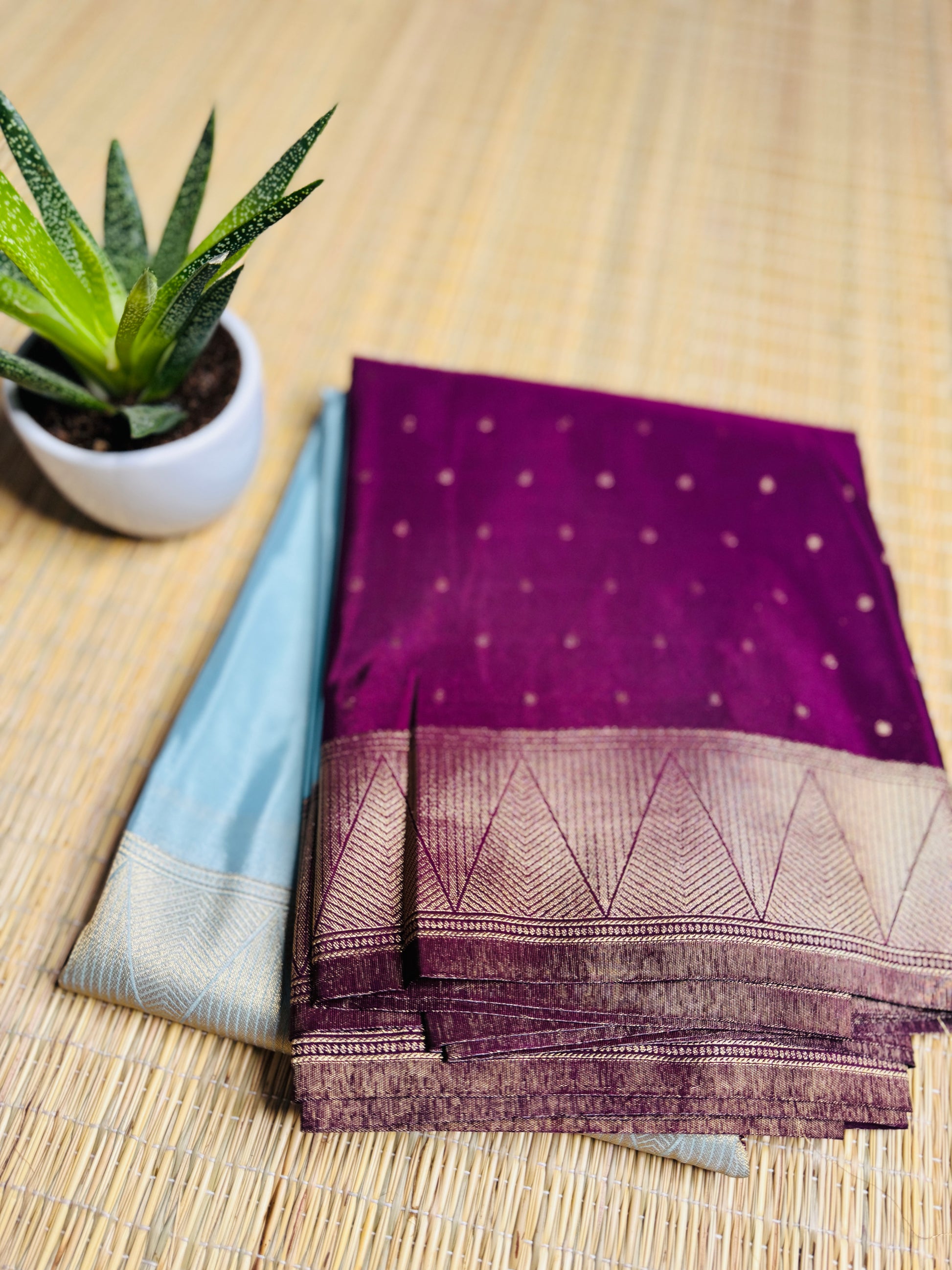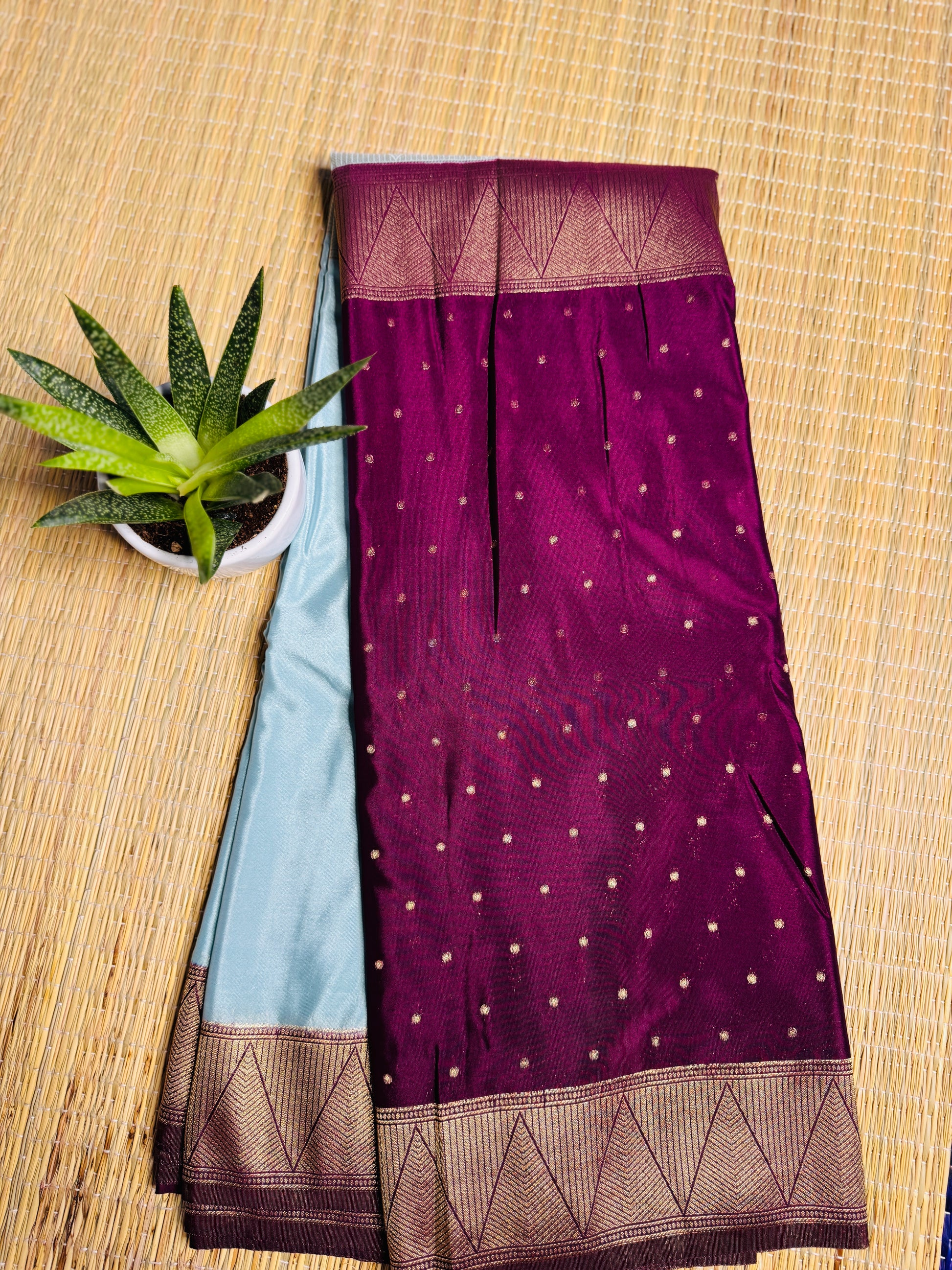 Light pastel blue& Deep plum half & half Mysore silk crepe saree