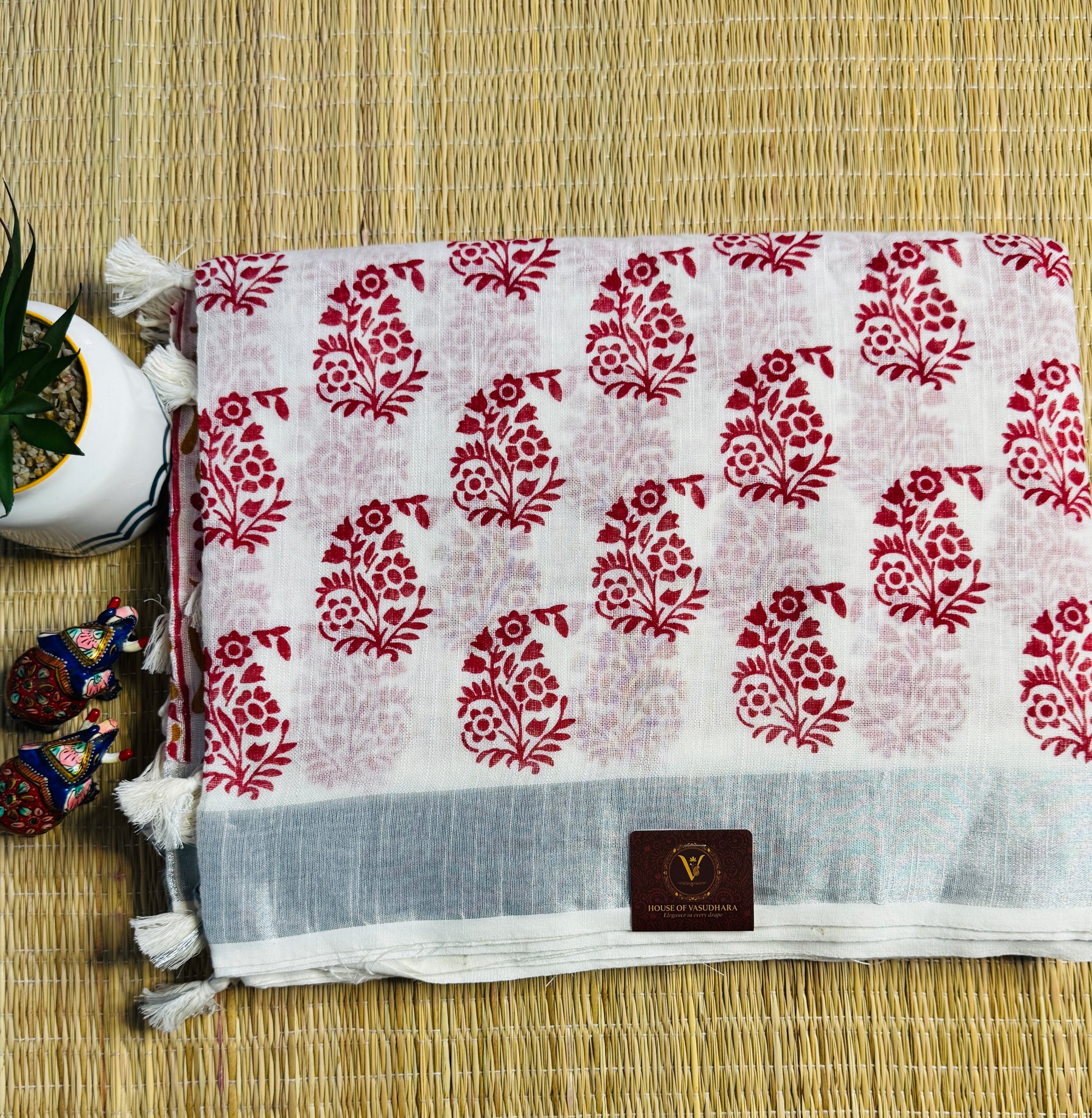 Design: Hand block floral butta motifs all over the body and Tassels(Hand-tied white tassels on the pallu end)