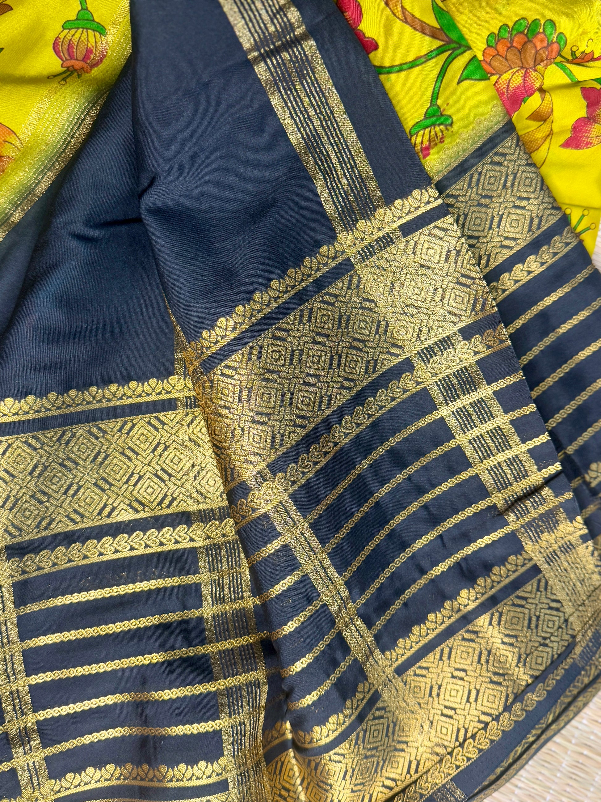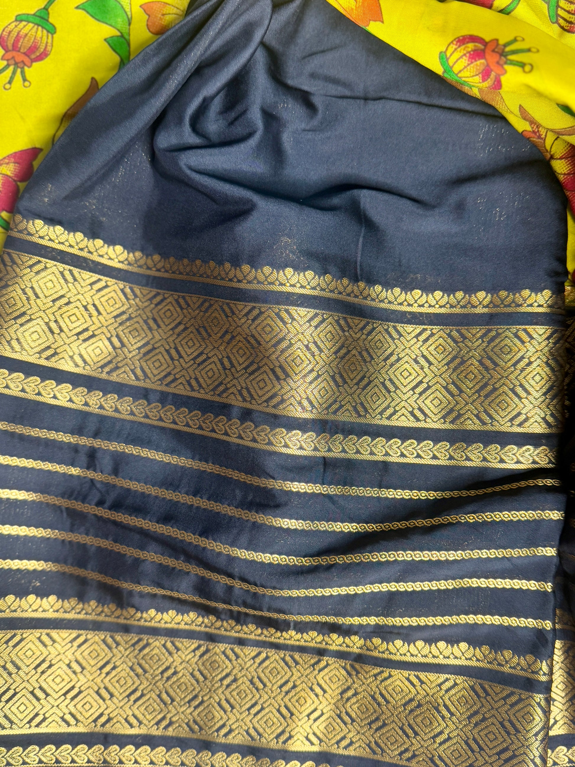 Blouse : Contrast color blouse with Border featuring traditional diamond and leaf motifs.